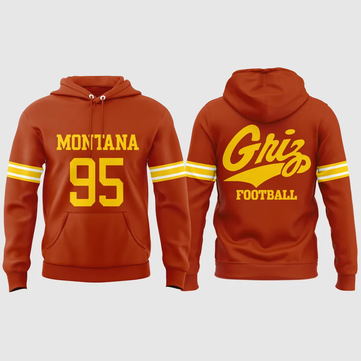 This Montana Grizzlies Throwbacks Uniform Hoodie is designed to emulate the look of the 1995 football uniform. Key design features include the maroon or burnt orange color with bright yellow screen-printed graphics. The front displays “MONTANA 95” in large block lettering, mimicking a jersey. The back proudly features the script “Griz FOOTBALL”. The hoodie includes an adjustable drawstring hood, a front pouch pocket, and white/yellow striped accents on the sleeves.