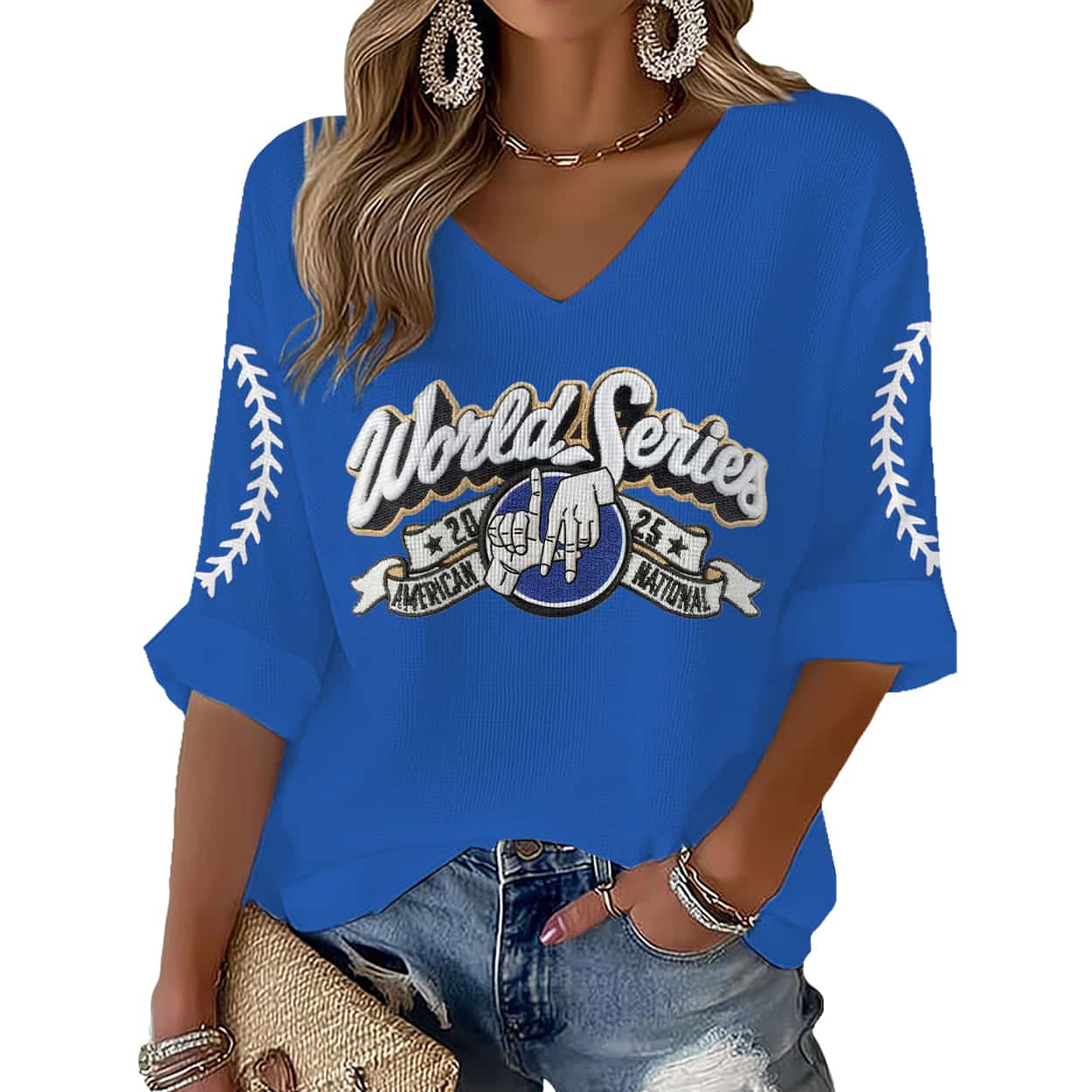 Showcase your Dodgers pride with this stylish 2025 World Series Waffle T-Shirt. This women’s top comes in a vibrant royal blue and features a comfortable, flattering v-neck cut. The soft waffle-knit fabric is complemented by sporty baseball lacing graphics on the 3/4 rolled sleeves. The main feature is a large, detailed patch celebrating the 2025 Fall Classic, showing the “World Series” script over a unique central emblem of the “LA hand sign,” all set above the “2025 AMERICAN NATIONAL” banner.
