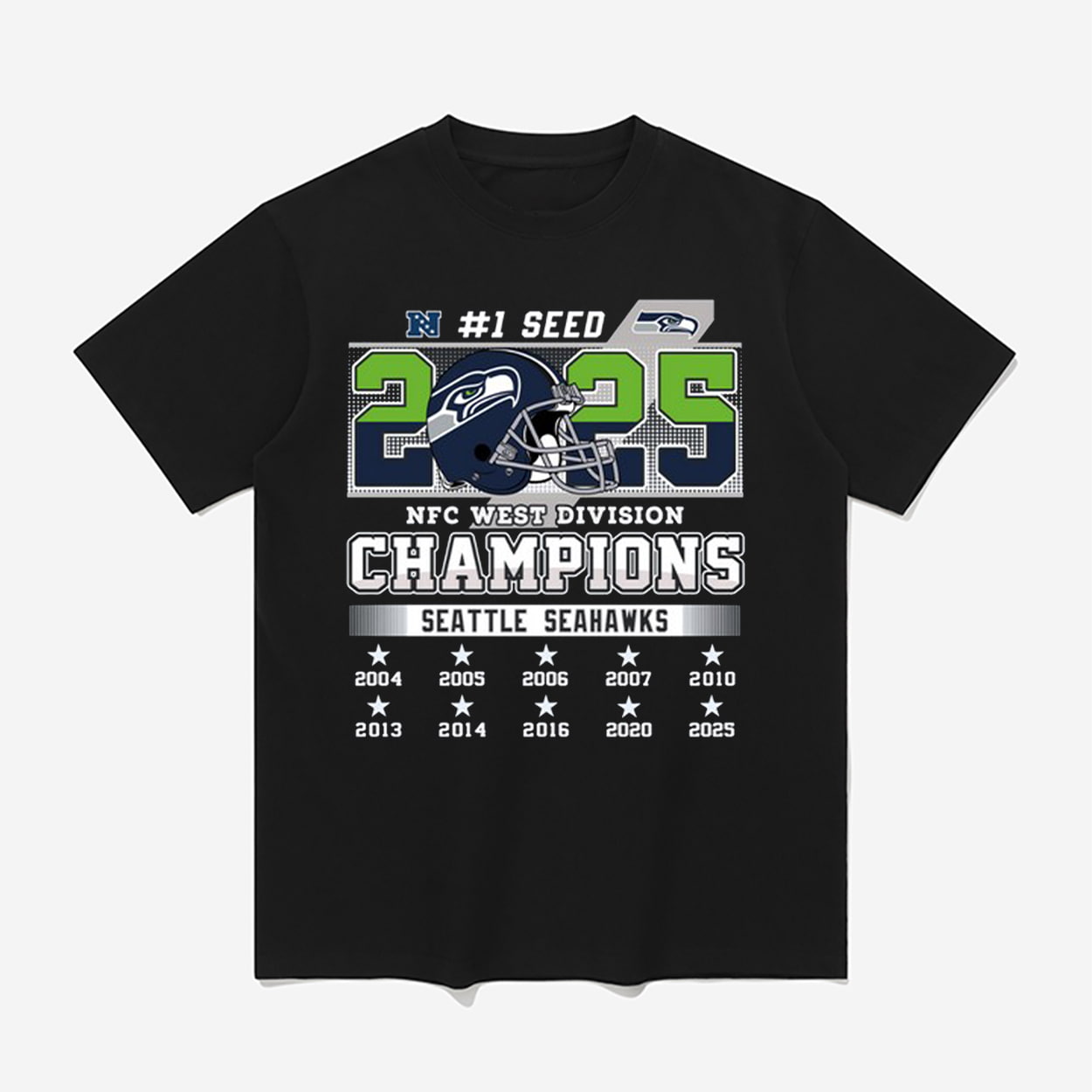 Celebrate the return of the 12th Man’s dominance with this 2025 Seahawks #1 Seed NFC West Champions Shirt. Commemorating the franchise-record 14-3 season and the decisive Week 18 victory over the 49ers, this black tee features the official “NFC West Division Champions” wordmark and a historic list of title-winning years. Own the look that proves the road to the Super Bowl goes through Seattle.