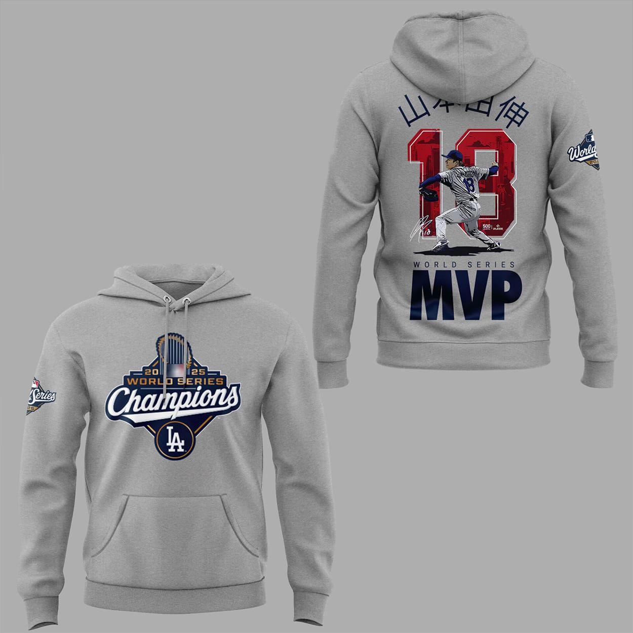 This t-shirt is the official celebration of the 2025 World Series MVP. This shirt is designed for a champion, featuring a stunning, high-quality graphic honoring Yoshinobu Yamamoto’s incredible achievement. It’s emblazoned with bold “WORLD SERIES MVP” text, the Dodgers “LA” logo, and the official 2025 World Series Champions patch, making this a championship-caliber design for a championship-caliber player.