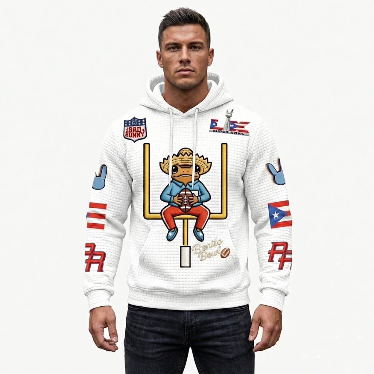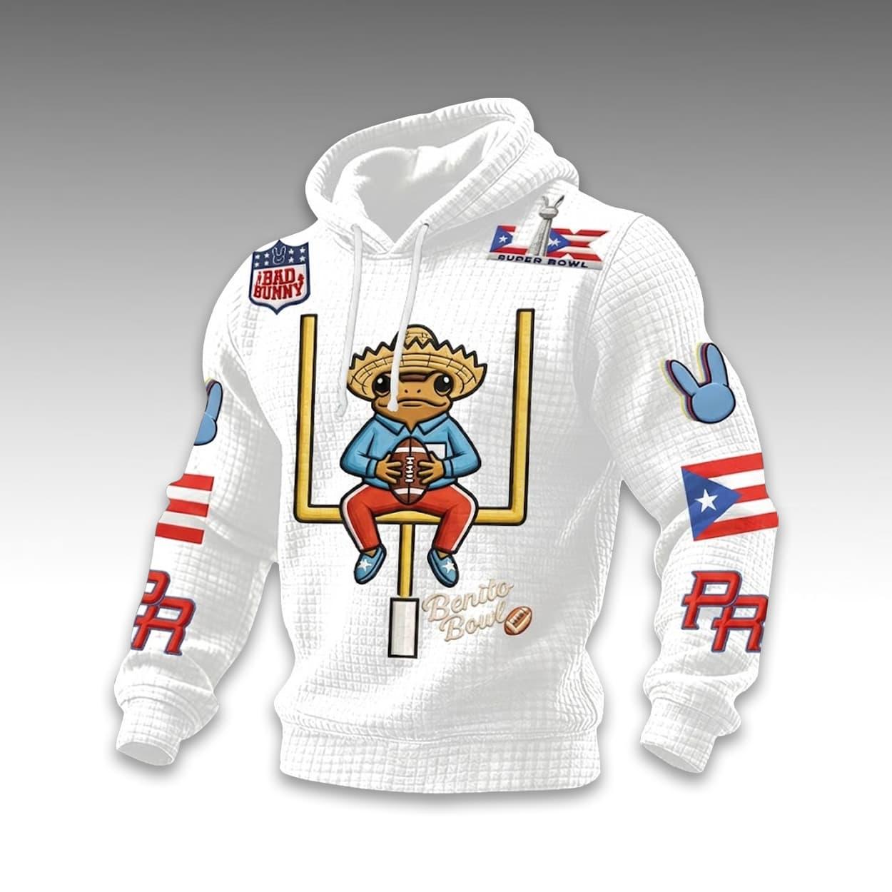 Command the room in this uniquely textured, white waffle-knit hoodie designed for a high-end, structured feel. The center graphic features a whimsical sombrero-wearing frog perched on a goalpost holding a football, a playful nod to the “Benito Bowl”. The design is rich with detail, including a “BAD BUNNY” shield on the chest, blue bunny ear icons on the sleeves, and the official Super Bowl LX logo on the shoulder, all accented by vibrant Puerto Rican flags.