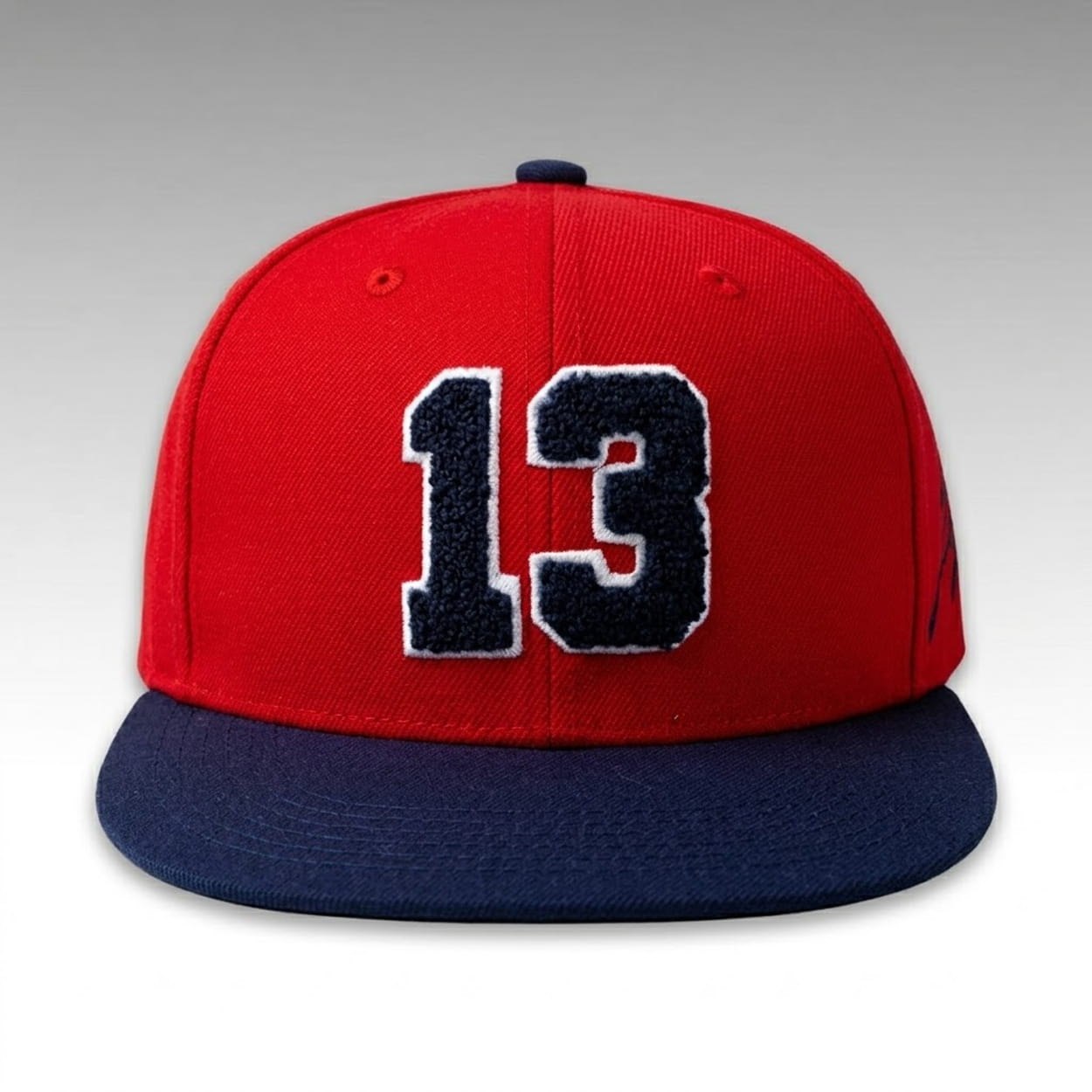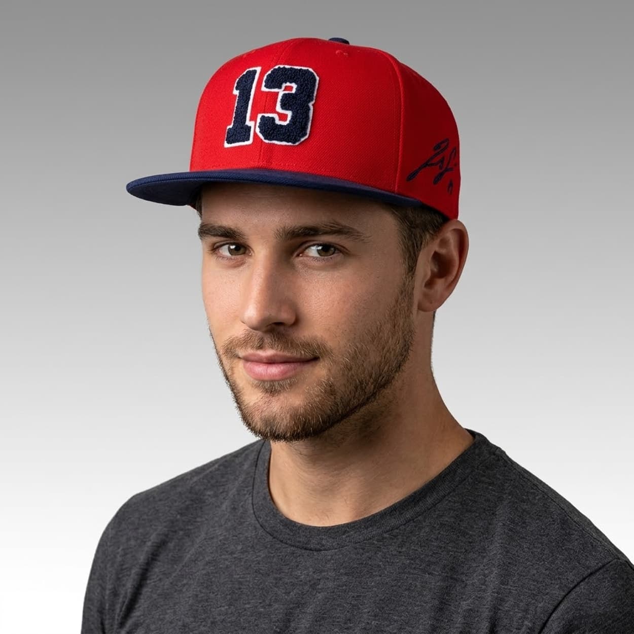 This cap features a large, textured chenille number “13” patch prominently centered on the front panels. The design includes a classic flat brim for a modern, athletic profile. Completing the custom, player-focused aesthetic, an embroidered replica of Ronald Acuna Jr.’s signature is carefully stitched along the side panel, offering a premium and personalized finish.
