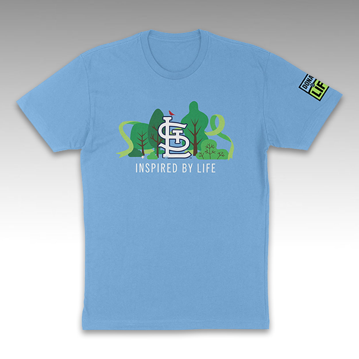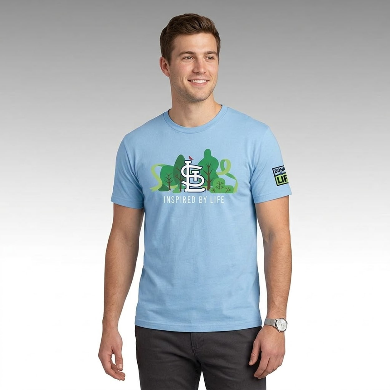 Make a meaningful statement with a beautifully designed tee. The 2026 Cardinals Donate Life Day Shirt features a light blue base highlighting a serene, nature-inspired chest graphic. The iconic interlocking “StL” logo, complete with a perched red cardinal, is elegantly framed by stylized green trees and a flowing awareness ribbon. Clean “INSPIRED BY LIFE” typography rests directly below, while the official Donate Life emblem accents the left sleeve to complete the look.