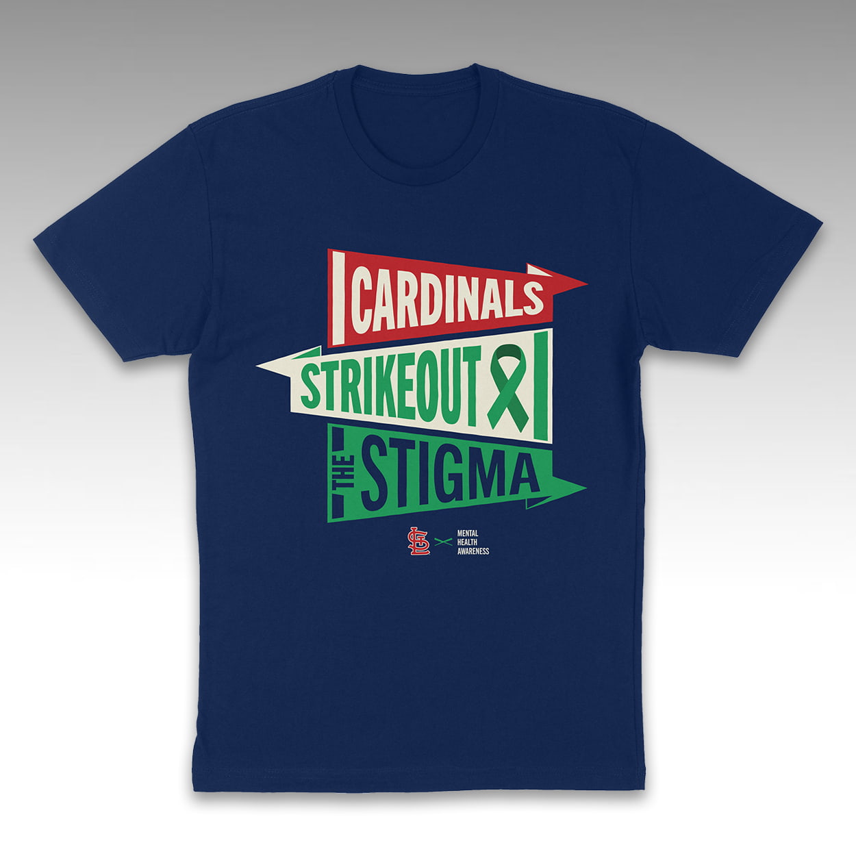 Make a bold statement both inside and outside the ballpark. The 2026 Cardinals Mental Health Awareness Day Shirt features a striking, vintage-inspired stacked pennant graphic across the chest. Set against a classic navy blue backdrop, the retro design boldly reads “CARDINALS STRIKEOUT THE STIGMA,” seamlessly integrating the green awareness ribbon right into the typography. This impactful design is beautifully completed with the legendary interlocking “StL” logo resting beside the event title near the bottom hem.