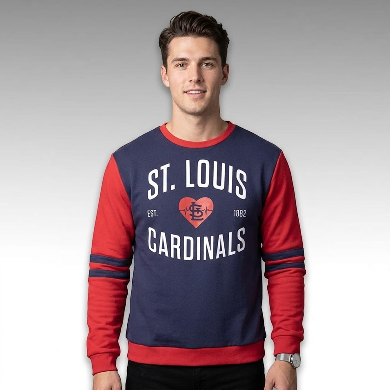 Step into the stadium with a cozy look that champions an incredible cause. The 2026 Cardinals Nurses Appreciation Night Sweatshirt features a striking colorblock design, pairing a navy blue body with vibrant red sleeves adorned by dual athletic stripes. The chest proudly displays bold “ST. LOUIS CARDINALS” typography framing the standout design element: a red heart graphic intersected by a vital EKG line and the classic interlocking “StL” logo. Subtle “EST. 1882” detailing flanks the center graphic, completing this thoughtful, healthcare-inspired aesthetic.