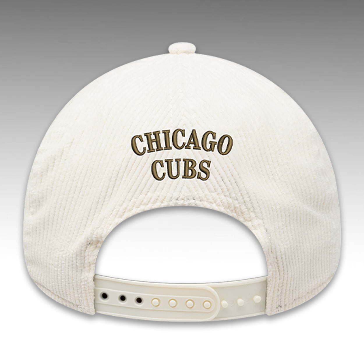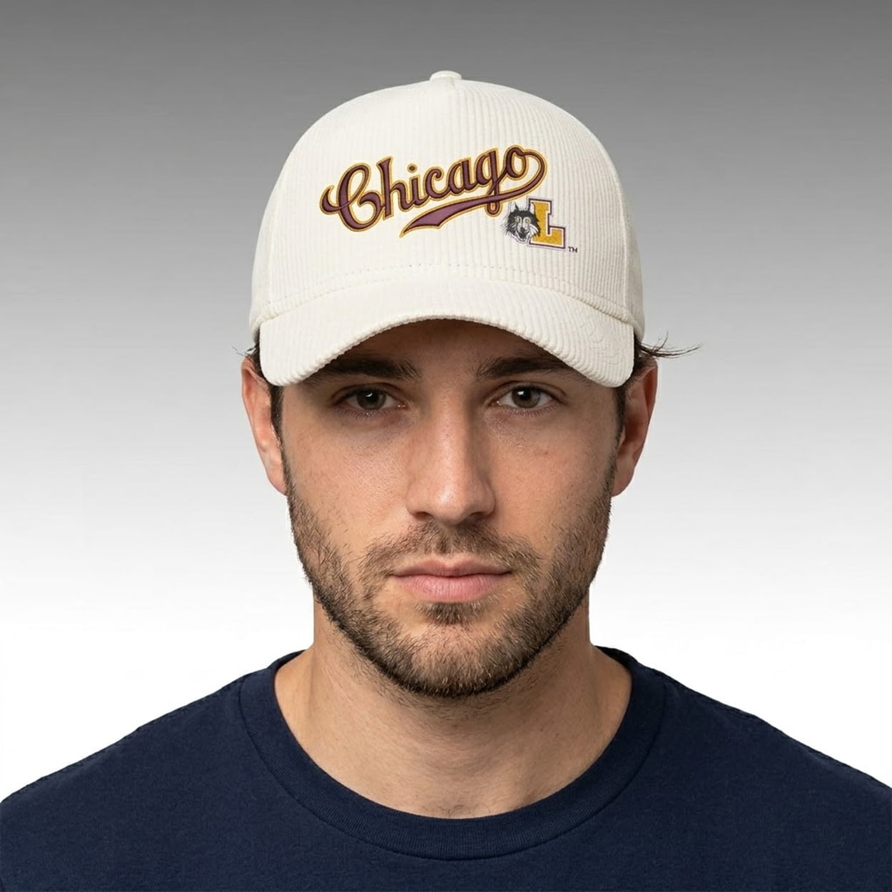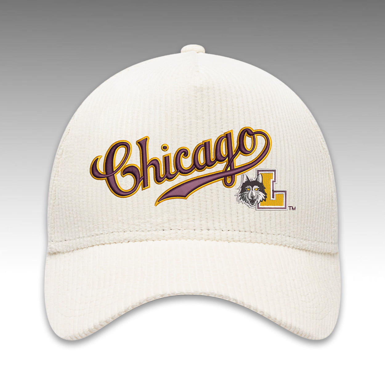 The front crown features a flowing “Chicago” script logo underscored by a sweeping tail graphic. Positioned adjacent to this prominent typography is the official university athletic logo, displaying the fierce Rambler wolf head emerging from a collegiate block “L”. The structured, six-panel cap is crafted entirely from textured corduroy fabric, providing a unique, vintage-inspired tactile element. An adjustable snapback closure ensures a customized fit, while the reverse side is finished with classic “CHICAGO CUBS” block lettering embroidered directly above the closure mechanism.