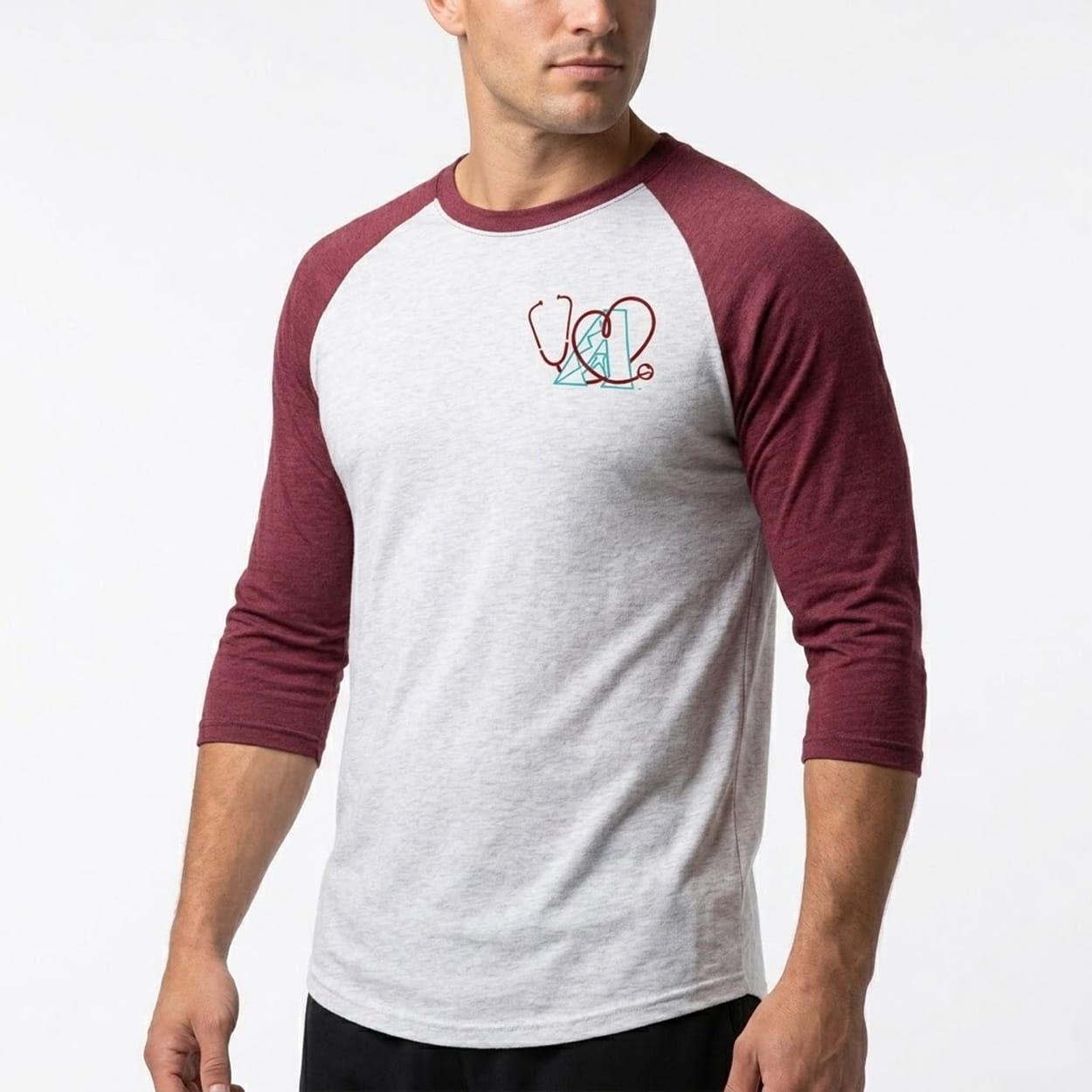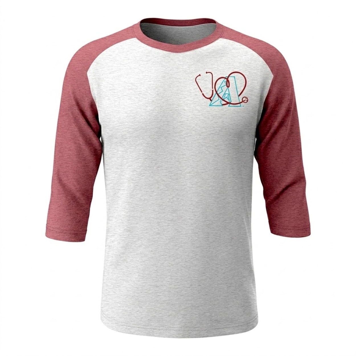 This baseball raglan features a comfortable heather gray body paired with contrasting red sleeves and collar trim. The left chest prominently displays a custom-designed graphic: a red medical stethoscope elegantly shaped into a heart, integrating a small baseball and the iconic Arizona Diamondbacks “A” team logo. It seamlessly blends timeless athletic design with thoughtful medical imagery.