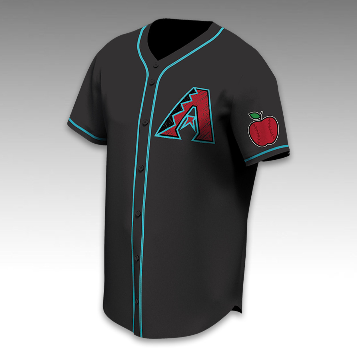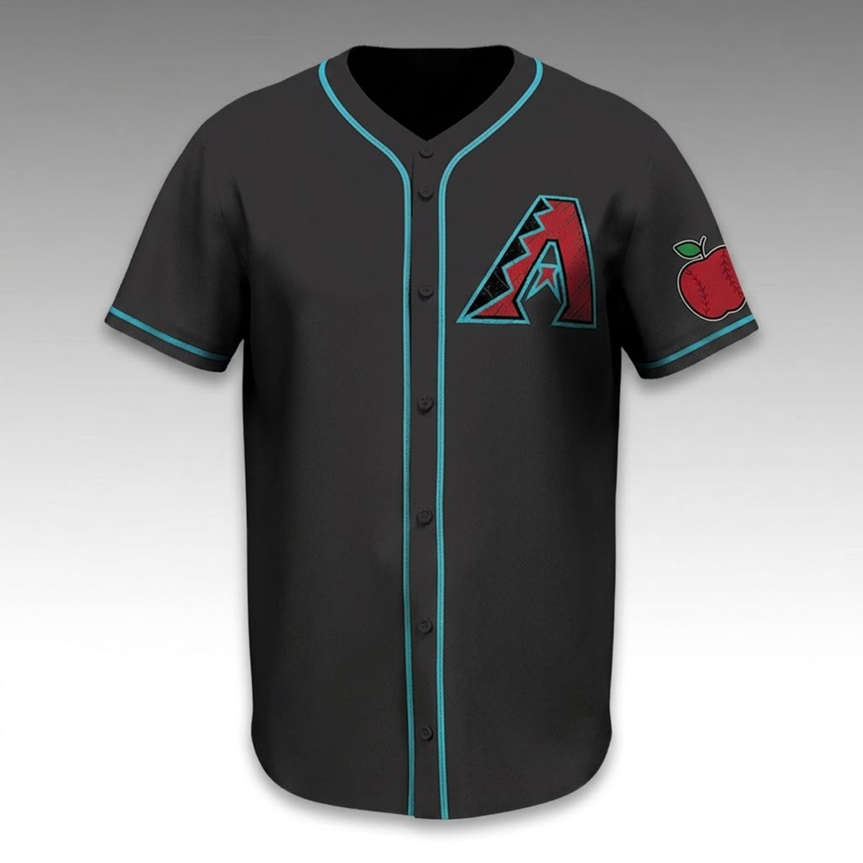 This jersey features a sleek dark body highlighted by vibrant contrasting piping along the placket, collar, and sleeve cuffs. The left chest proudly displays the iconic Arizona Diamondbacks “A” logo. Adding a unique, thematic touch, the left sleeve is decorated with a custom patch depicting a classic teacher’s apple cleverly detailed with traditional baseball stitching.