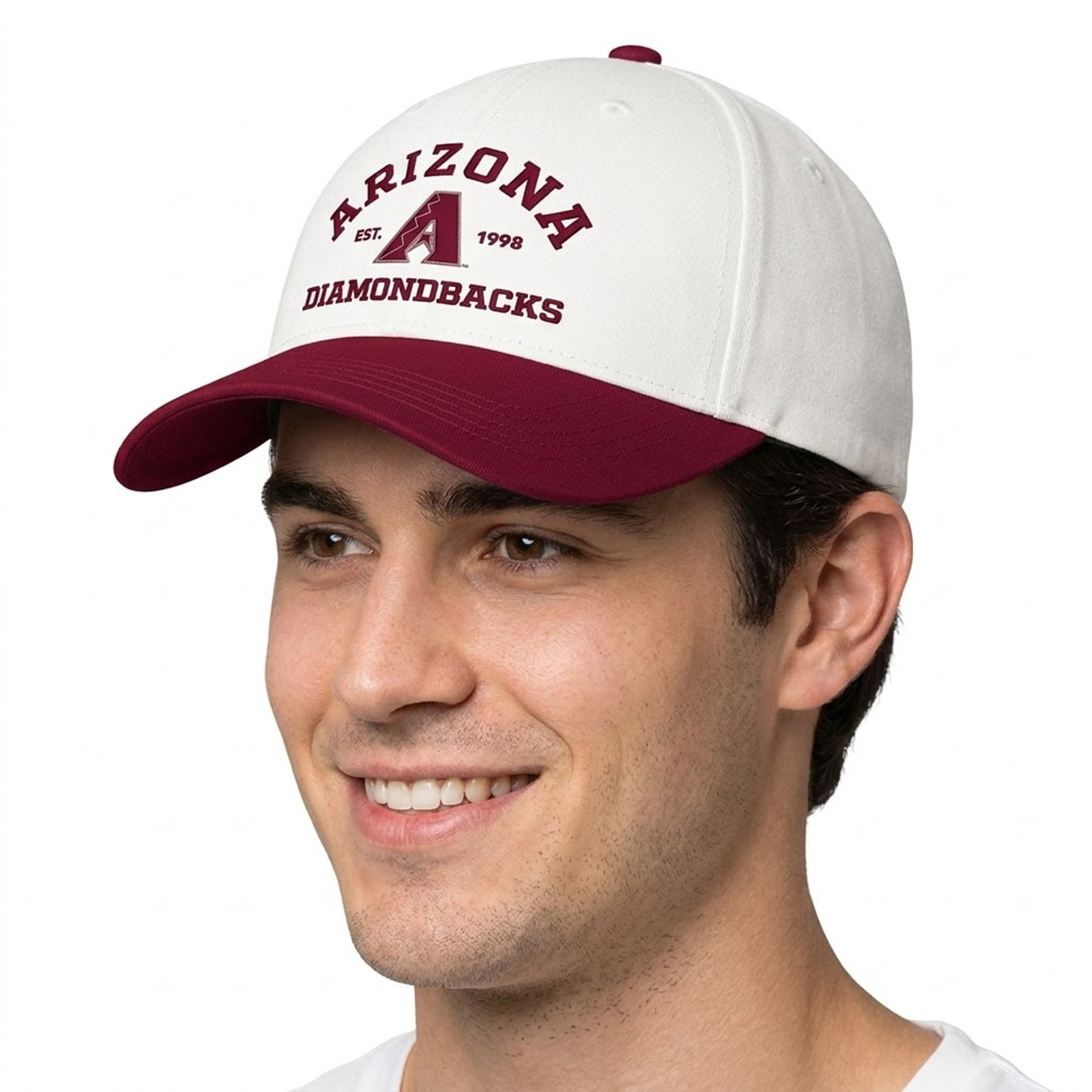 This structured baseball cap features a clean, two-tone aesthetic with a light crown and a contrasting curved brim. The front is decorated with vintage-inspired athletic typography reading “ARIZONA DIAMONDBACKS” arched around the central team “A” logo, alongside “EST. 1998” detailing. It delivers a relaxed, classic athletic profile that perfectly complements active, everyday streetwear.