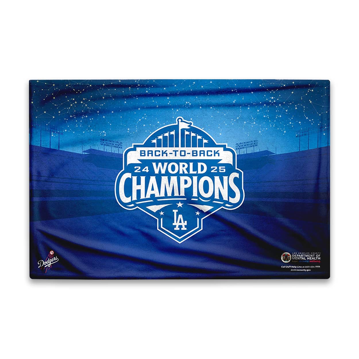 Showcase your team pride alongside a powerful message. The 2026 Dodgers Mental Health Awareness Night Blanket features a beautifully detailed illustration of the stadium beneath a starry sky. The centerpiece is a massive crest boldly celebrating the back-to-back 2024 and 2025 World Series victories, anchored by the classic “LA” insignia. The design is respectfully completed with the Los Angeles County Department of Mental Health logo and supportive resources in the bottom corner.