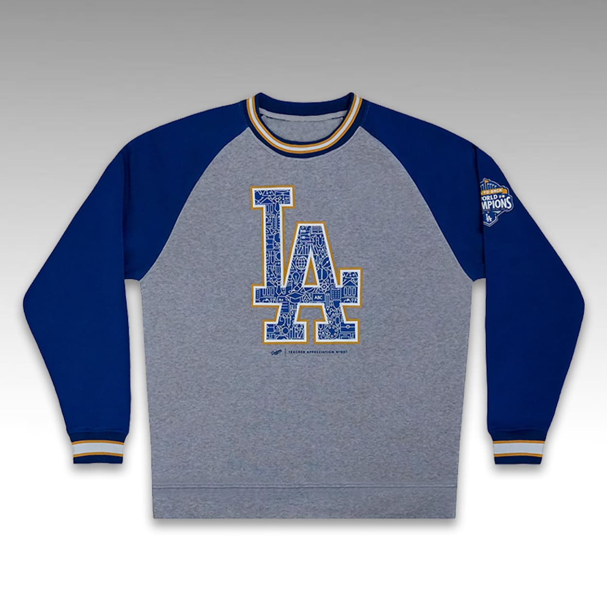 Honor educators with the 2026 Dodgers Teacher Appreciation Night Sweatshirt Giveaway! Commemorating the matchup against Rangers, this crewneck features an LA logo filled with school-themed illustrations and a World Champions patch. Perfect for teachers and fans. Secure this commemorative apparel today!