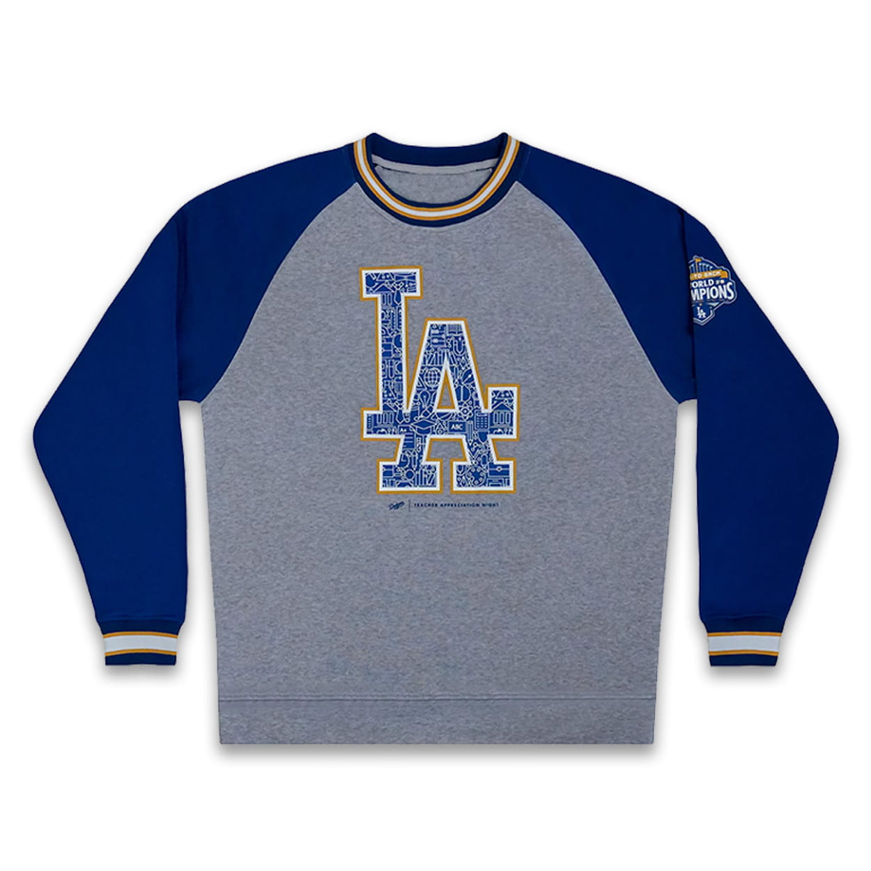 The 2026 Dodgers Teacher Appreciation Night Sweatshirt features a crewneck silhouette with raglan sleeves and striped ribbed trims. The chest showcases a large “LA” insignia filled with school-themed illustrations like books, apples, and graduation caps. A “Back to Back World Champions” crest adorns the left sleeve.