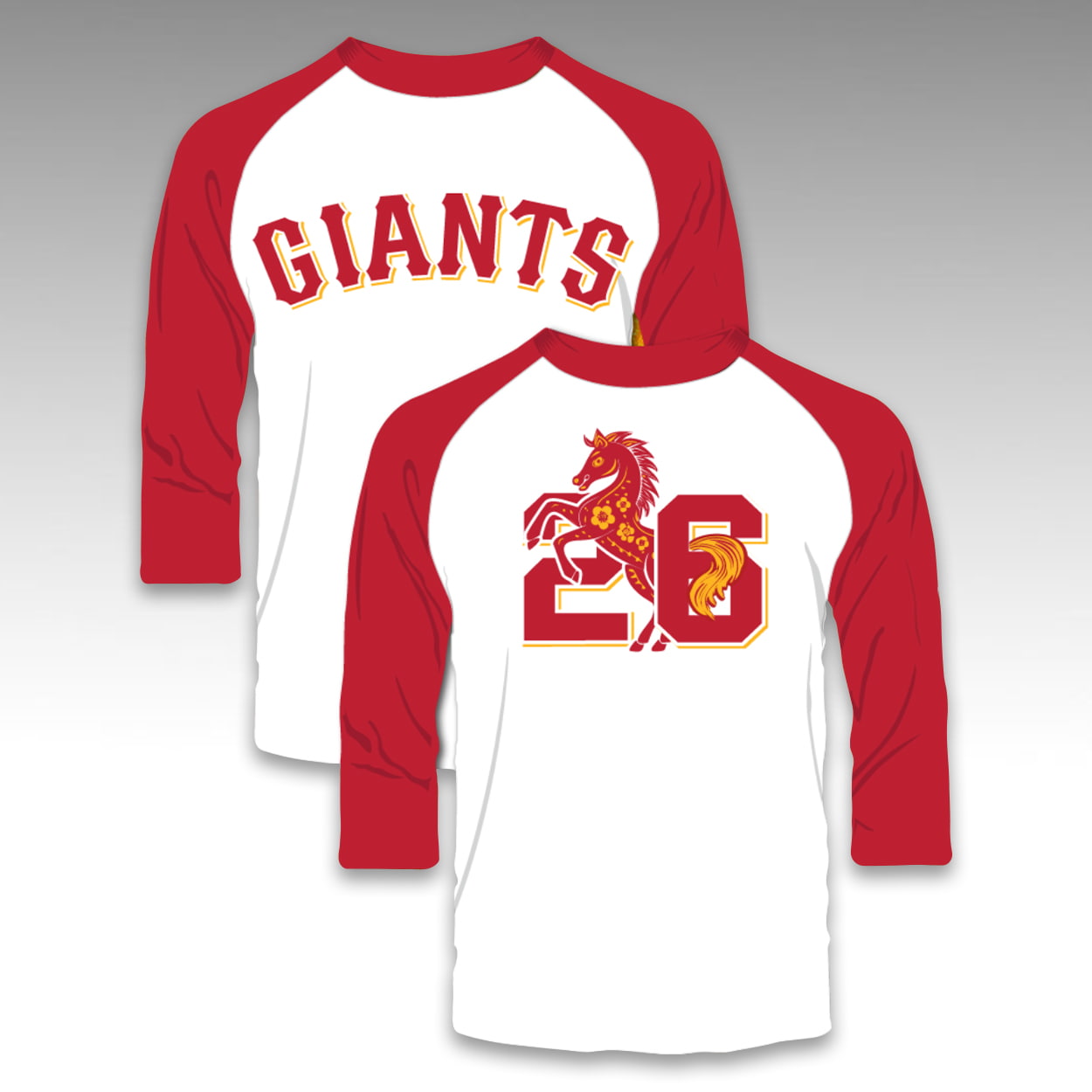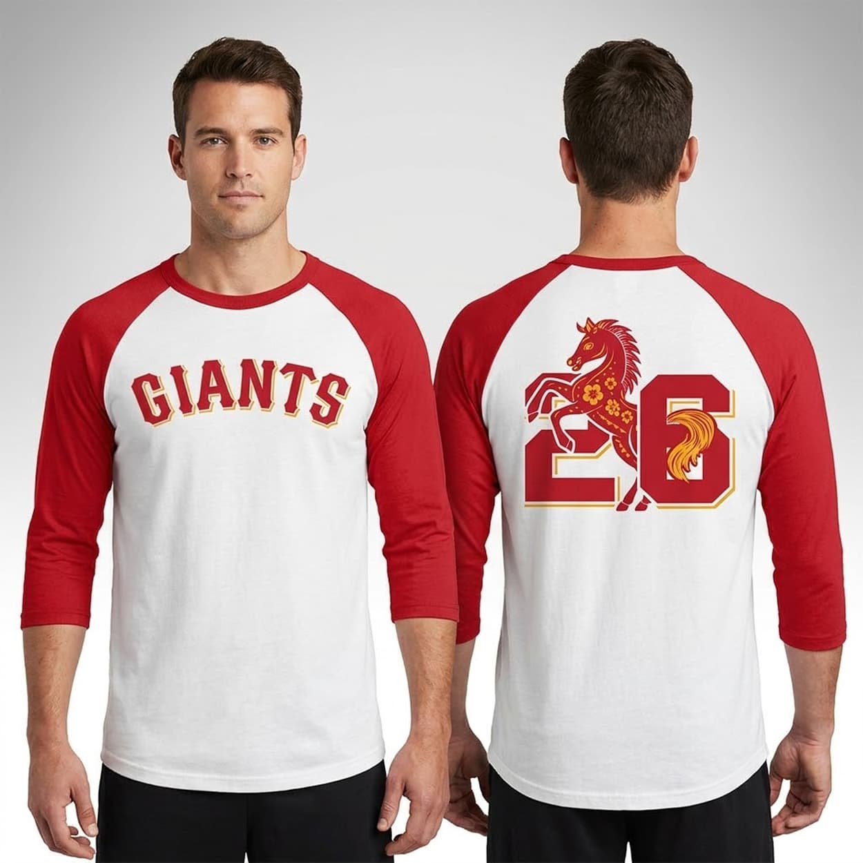 Make a striking cultural statement with the 2026 Giants Chinese Heritage Night Shirt. This raglan tee features the classic “GIANTS” wordmark arched proudly across the chest in a traditional block font with a drop shadow effect. The back of the garment highlights the number “26,” beautifully intertwined with an intricate illustration of a rearing horse adorned with stylized floral and cultural patterns.