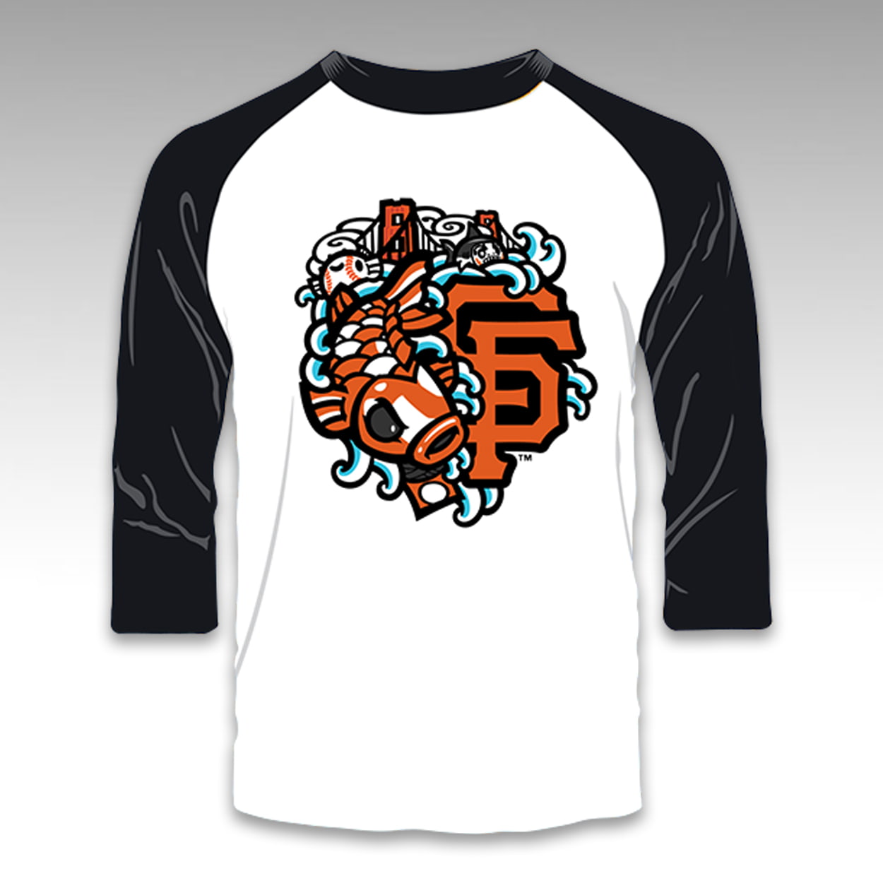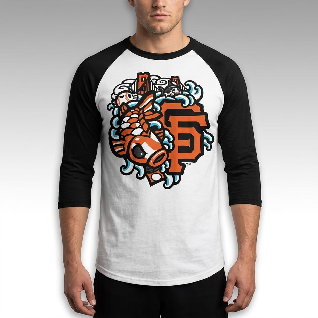 Make a cultural statement with the 2026 Giants Japanese Heritage Night Shirt. This 3/4-sleeve raglan tee features a central chest graphic that blends local pride with traditional motifs. The background incorporates regional landmarks, including a silhouette of the Golden Gate Bridge, accompanied by a baseball and subtle sea creature graphics, creating a distinct aesthetic.