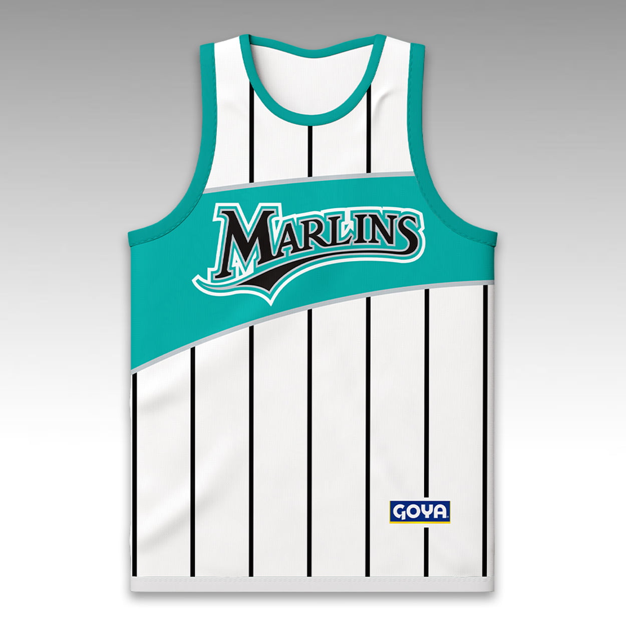 The 2026 Marlins Throwback Basketball Jersey features the classic script logo positioned over a diagonal mid-chest band. The sleeveless design incorporates retro vertical pinstripes throughout the body, accented by a Goya sponsor patch near the bottom hem. The back highlights a large “93” graphic honoring the inaugural season, topped with a custom “Fightin’ Fish” logo at the neckline.