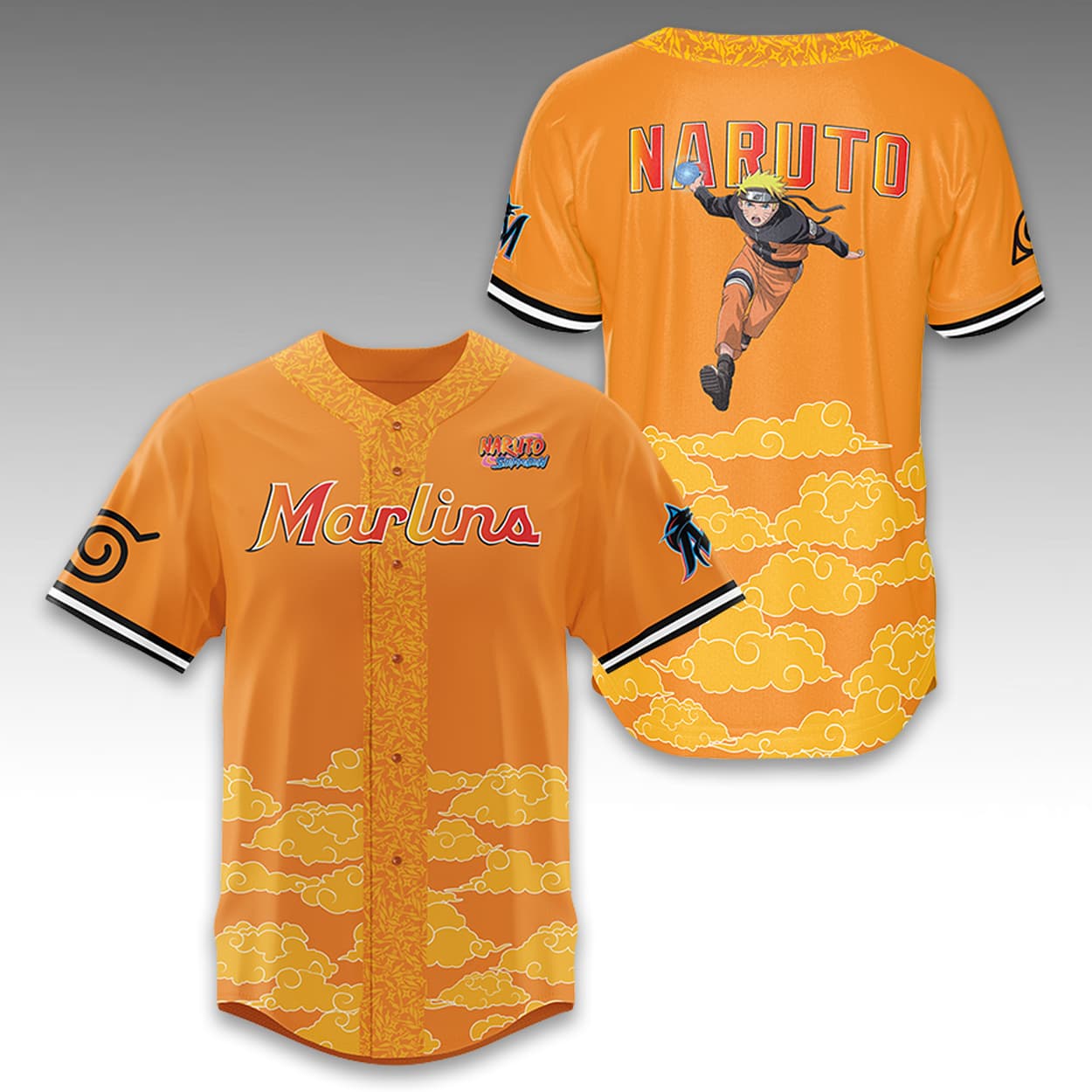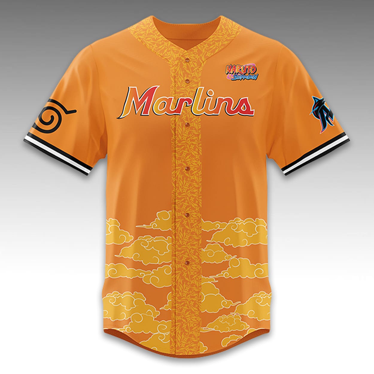 This jersey brilliantly fuses major league action with iconic anime aesthetics. The front displays the classic Miami Marlins script alongside the official Naruto Shippuden logo, anchored by an intricate ninja weapon pattern tracing the collar and placket. The bottom hem features a striking swirling cloud design. The right sleeve bears the Hidden Leaf Village symbol, while the left sleeve showcases the Miami Marlins logo. The back completes the look with bold “NARUTO” lettering above a dynamic graphic of Naruto Uzumaki wielding a Rasengan.