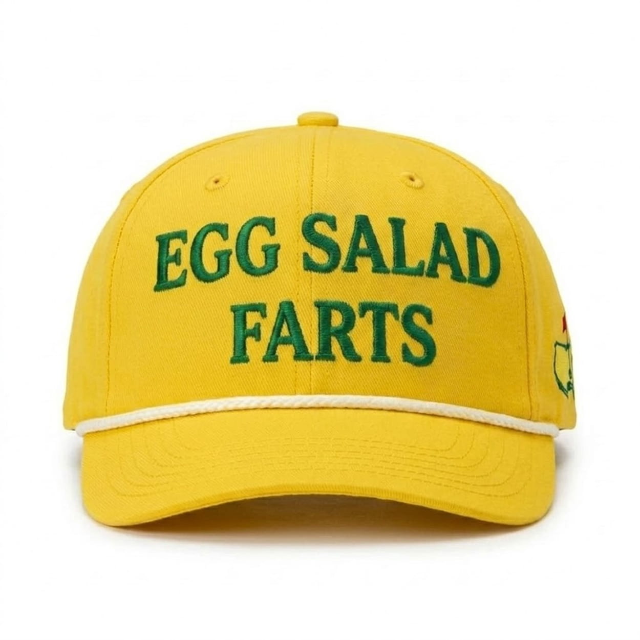 The front crown prominently displays the hilariously blunt phrase “EGG SALAD FARTS” in bold, raised green serif embroidery against a vibrant yellow background. It features a classic white braided rope across the visor base and a custom-stitched national map emblem pierced by a traditional golf pin on the side panel. This structured five-panel cap combines premium athletic design with a heavy dose of relatable course humor.