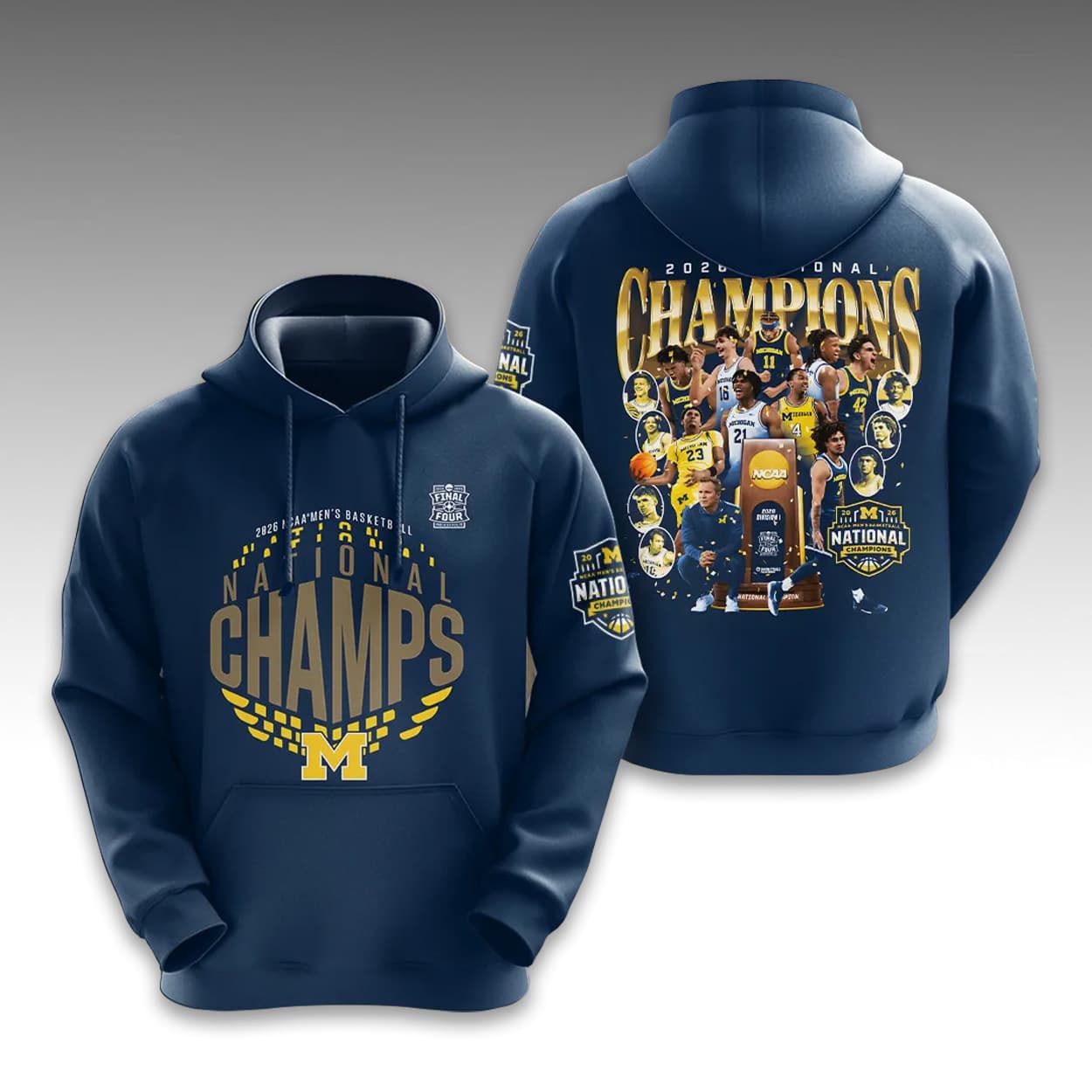 The front displays a circular “2026 NCAA MEN’S BASKETBALL NATIONAL CHAMPS” graphic accented with laurel wreaths, the collegiate block “M”, and a Final Four Indianapolis logo. The back showcases a massive tribute to the winning squad, featuring a dynamic action collage of the player roster, head coach, and the NCAA National Championship trophy beneath bold “2026 NATIONAL CHAMPIONS” typography.