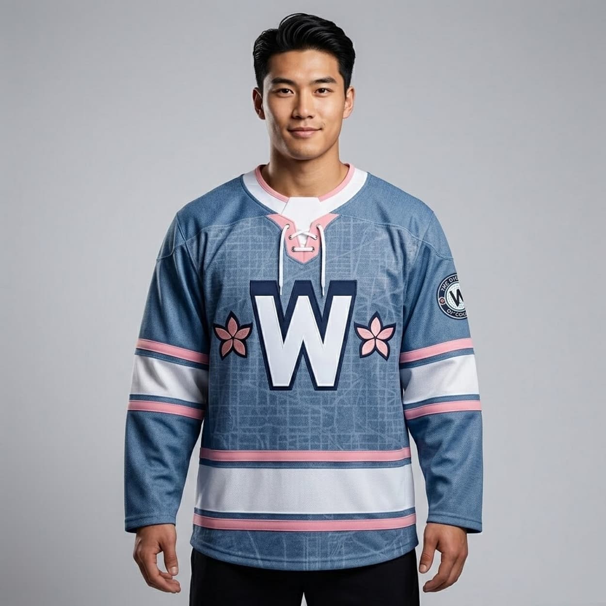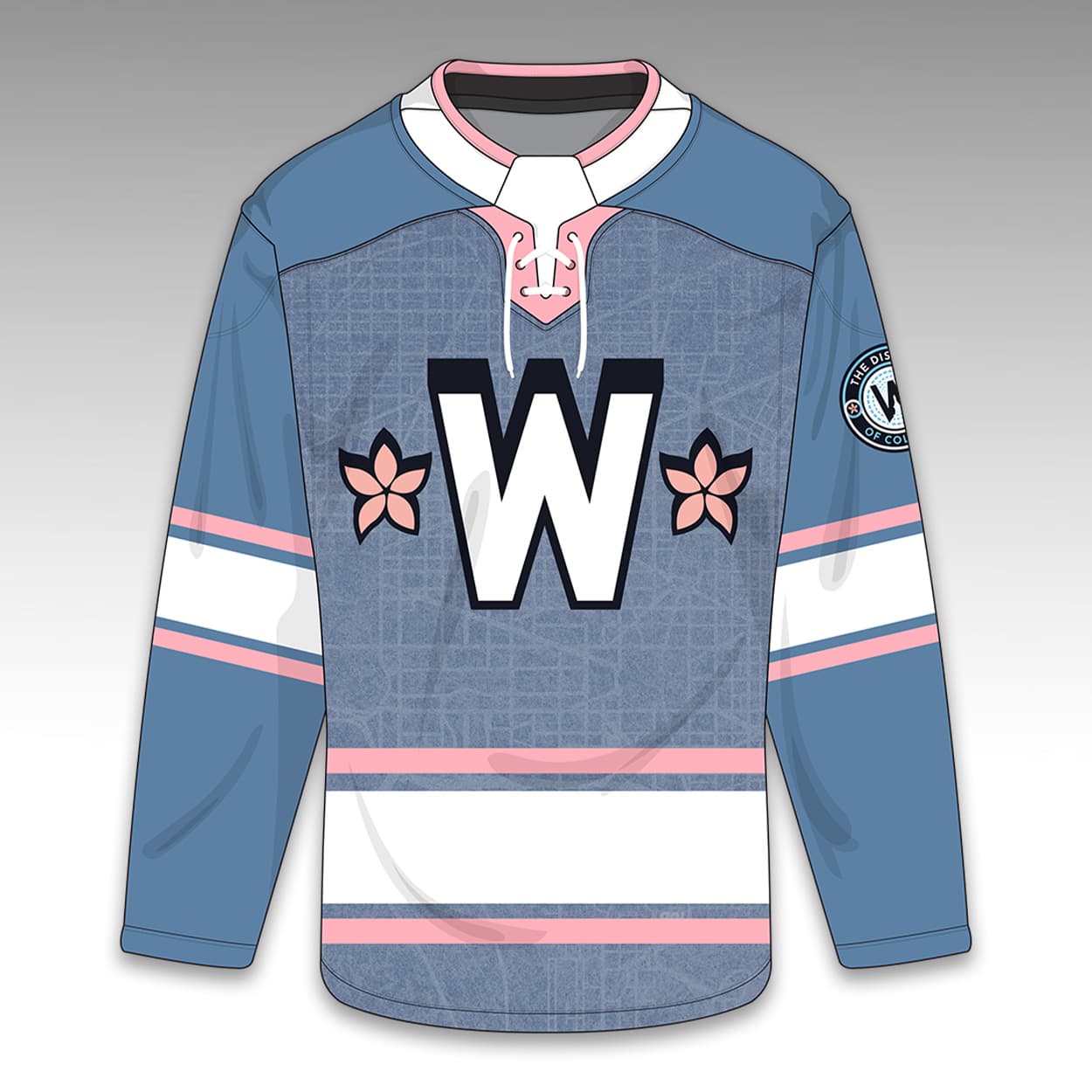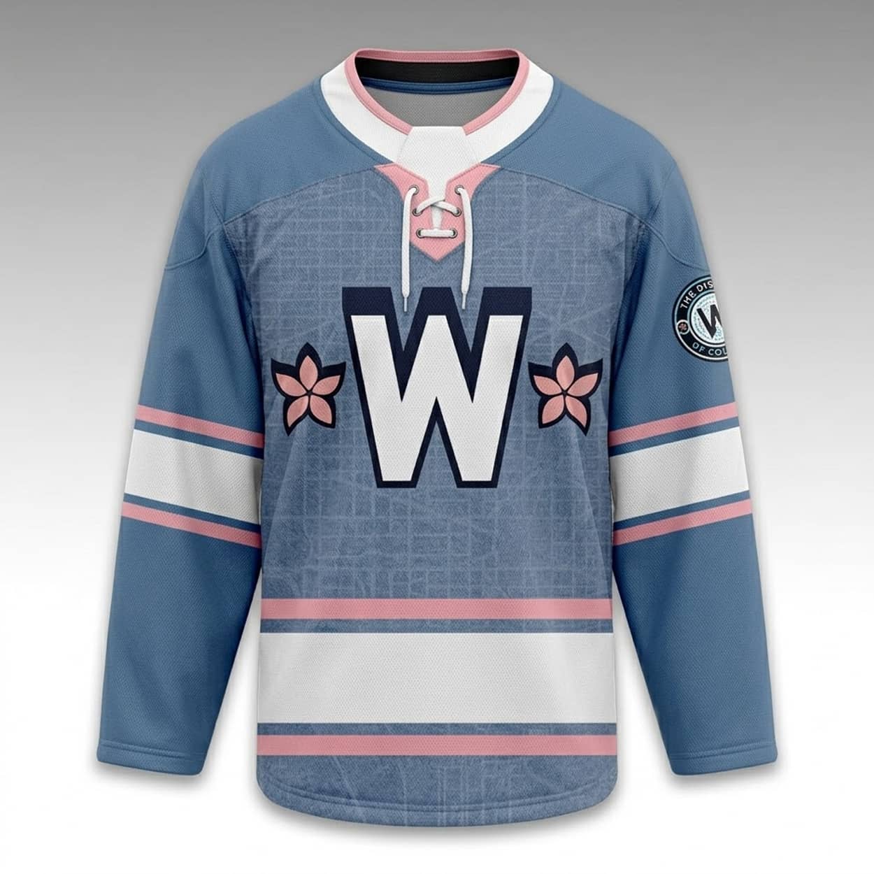 The 2026 Nationals City Connect Hockey Jersey features a central block “W” logo flanked by cherry blossom graphics on the chest. The background incorporates a detailed blueprint pattern of the Washington D.C. city grid. The design is completed by a traditional lace-up collar, striped athletic trim on the sleeves and waist, and the team’s District of Columbia logo patch located on the left bicep.