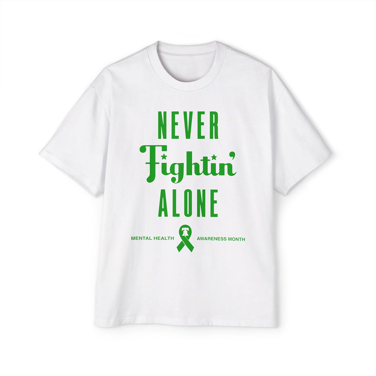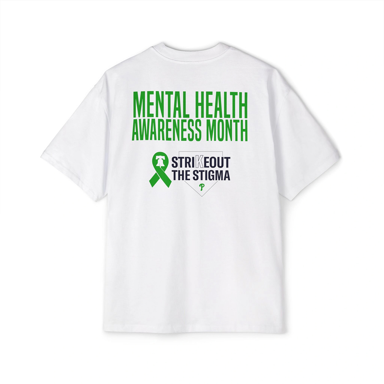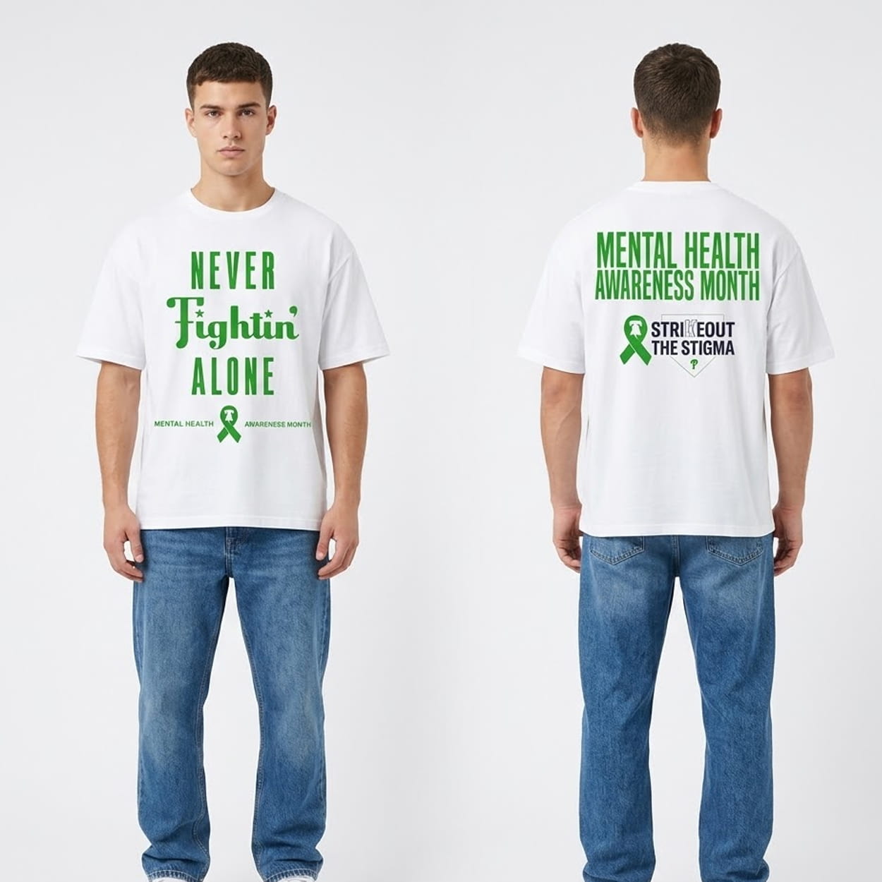 This impactful graphic tee delivers a powerful message of solidarity. The front boldly displays “NEVER Fightin’ ALONE” positioned above an awareness ribbon that incorporates the iconic Liberty Bell logo. The back reinforces the cause with “MENTAL HEALTH AWARENESS MONTH” lettering and a “STRIKE OUT THE STIGMA” graphic, complete with the classic Phillies ‘P’ logo set inside a home plate outline.