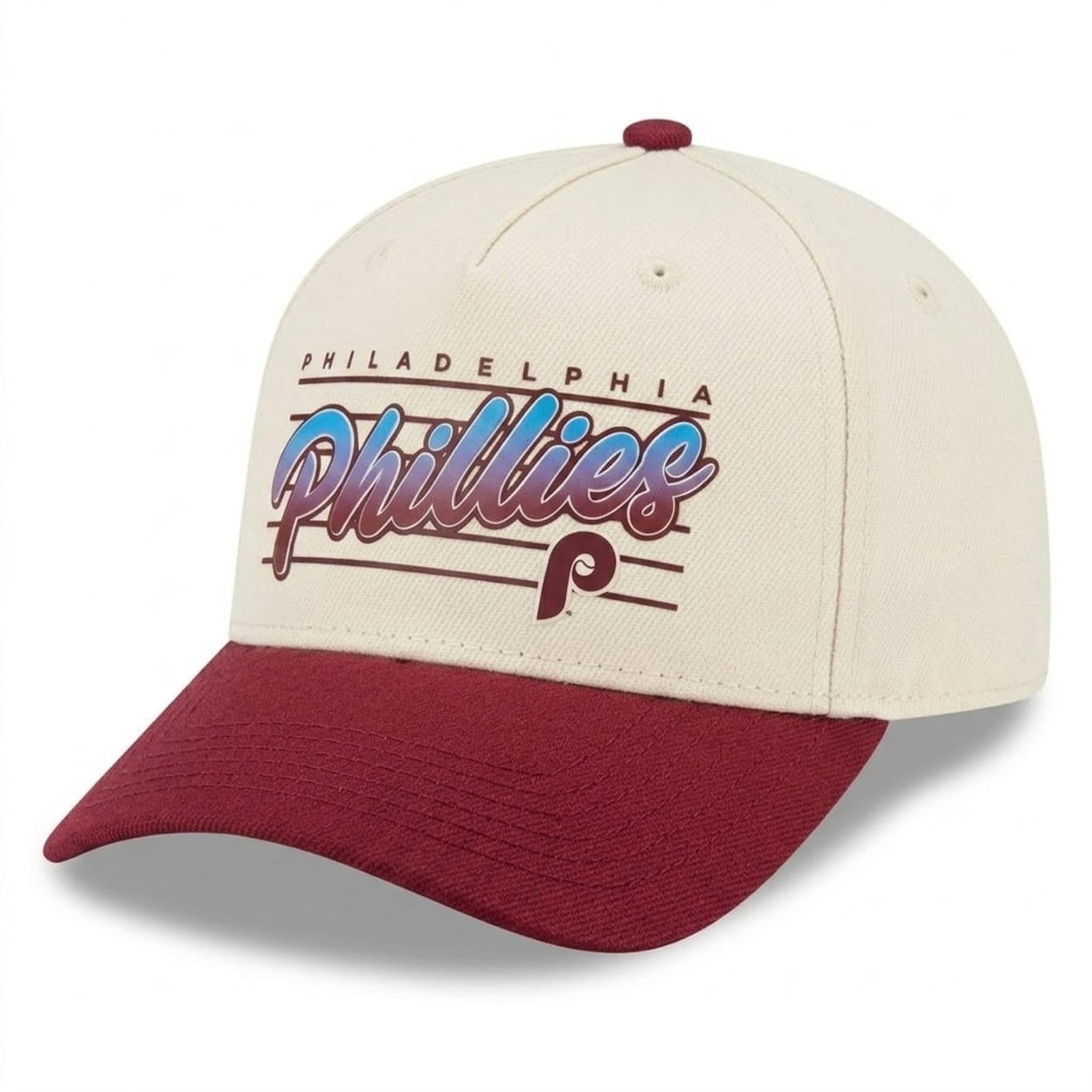 This structured cap perfectly captures a clean, throwback aesthetic. The front panel prominently displays the classic Philadelphia Phillies script logo overlaid on retro horizontal stripes. The vintage design is cleanly finished with the traditional Phillies ‘P’ logo positioned at the bottom right of the main graphic, paired with a contrasting brim and top button to complete the authentic seventies and eighties look.