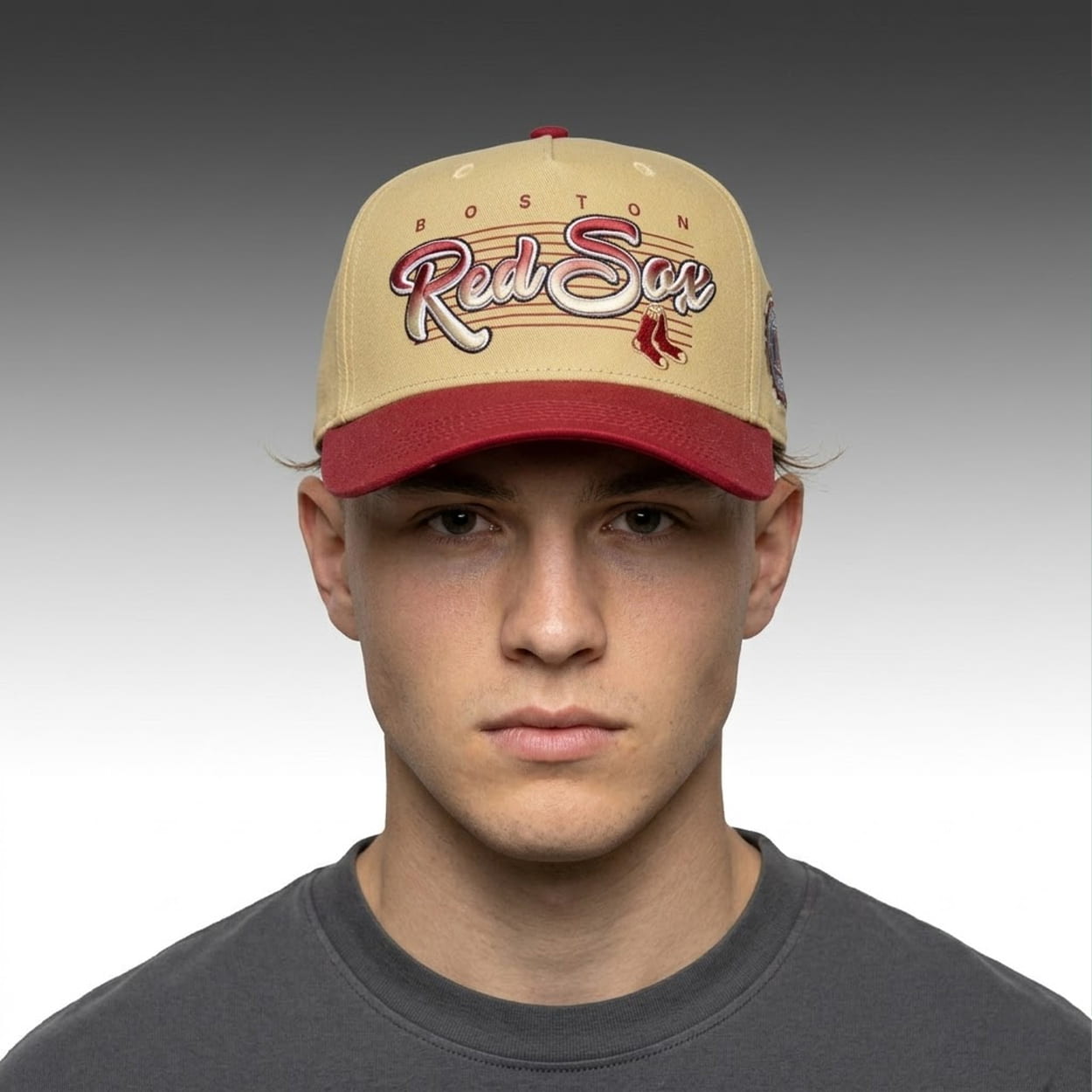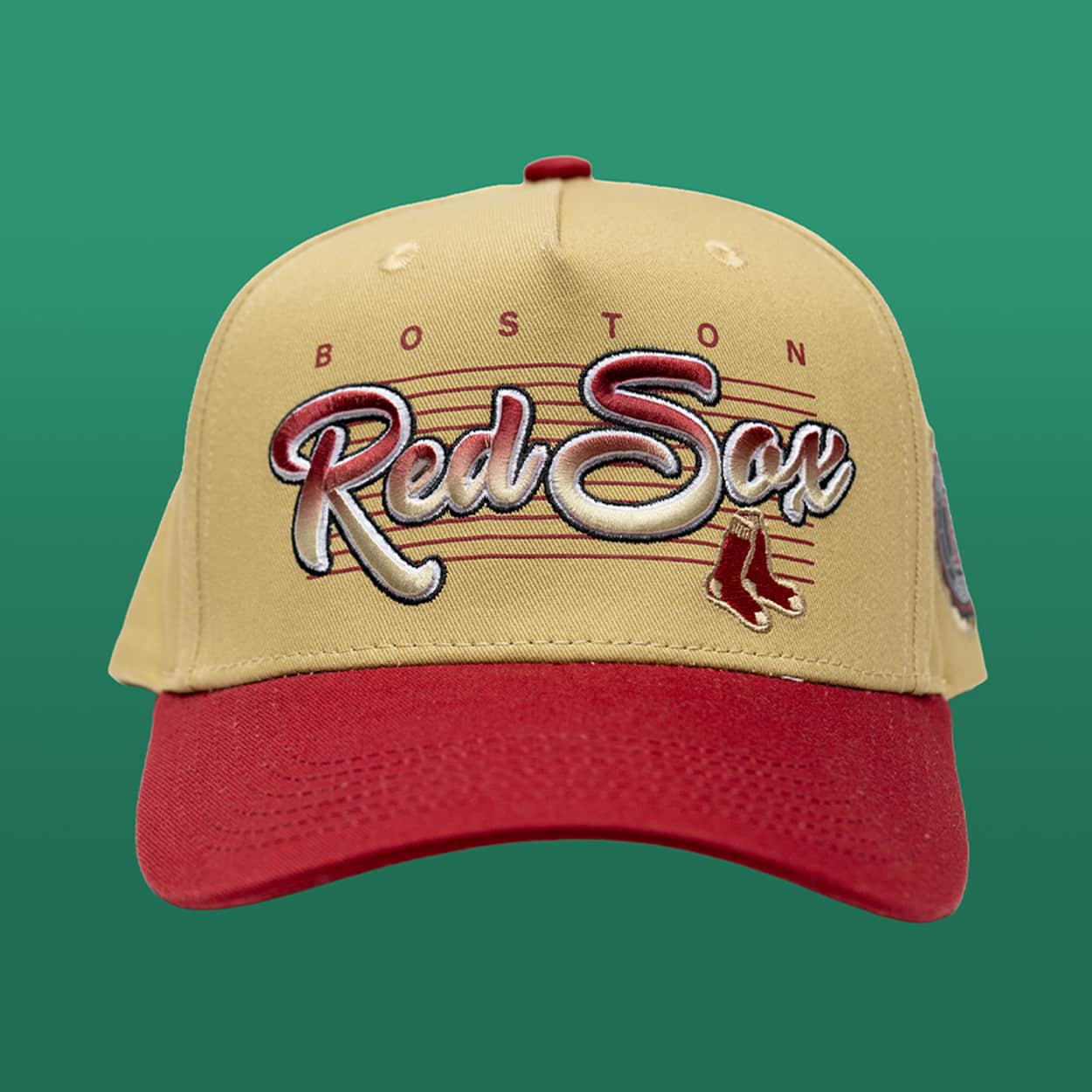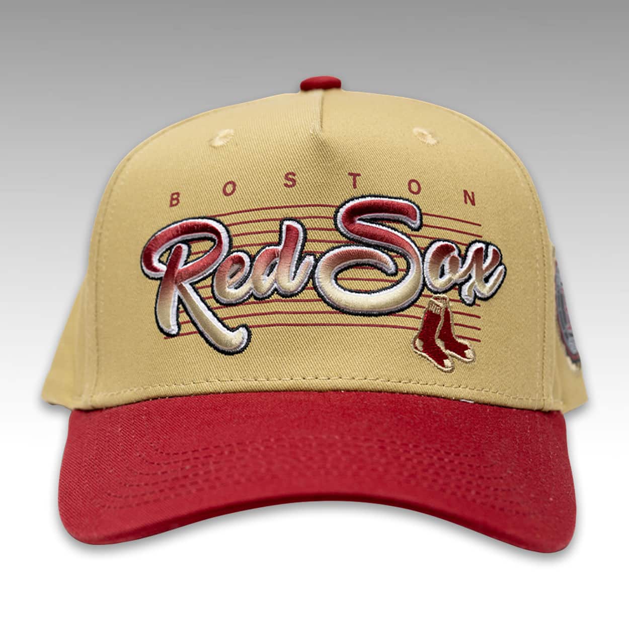 The 2026 Red Sox Boston College Hat showcases a striking two-tone colorway with a tan base and a vibrant red visor. The front highlights “BOSTON” in subtle arched lettering above a large, bold cursive “Red Sox” script featuring a unique red-to-tan gradient. Thin horizontal red lines serve as a dynamic backdrop behind the main text, while an embroidered pair of hanging red socks completes the collegiate-inspired aesthetic.