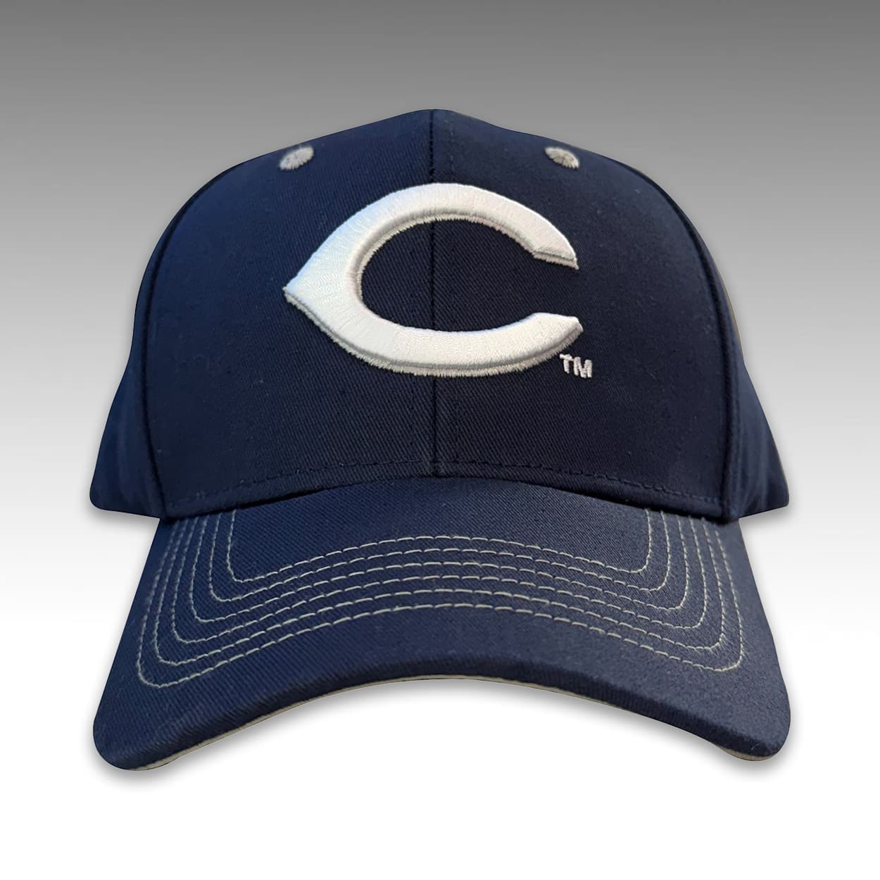 The front crown prominently displays the franchise’s iconic wishbone “C” logo in a thick, raised embroidery. The structured six-panel design is highlighted by contrasting thread utilized for the prominent stitching across the curved visor, eyelets, and panel seams. This distinct stitching pattern adds a dynamic visual texture that immediately distinguishes it from standard team merchandise, seamlessly blending professional baseball iconography with a classic collegiate aesthetic.