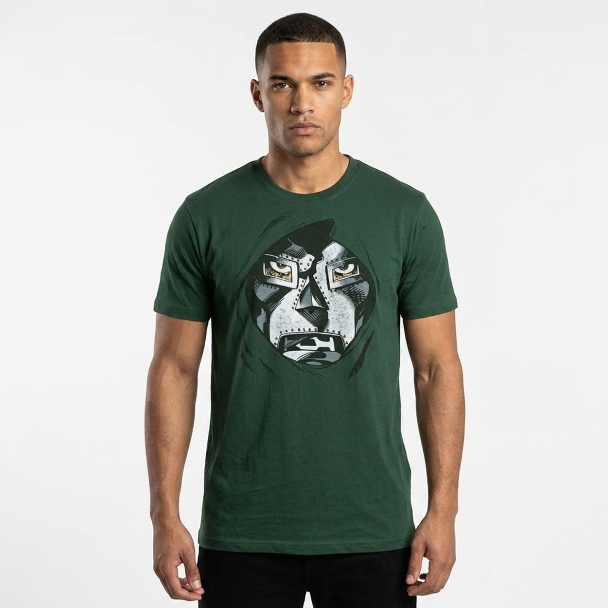 This t-shirt features a bold, comic-accurate front graphic of the legendary villain’s metallic mask peering out from beneath a shadowed hood. The stylized, vintage comic book art style creates a striking and highly recognizable focal point. It delivers a comfortable, relaxed fit that blends iconic pop-culture imagery with effortless everyday streetwear.
