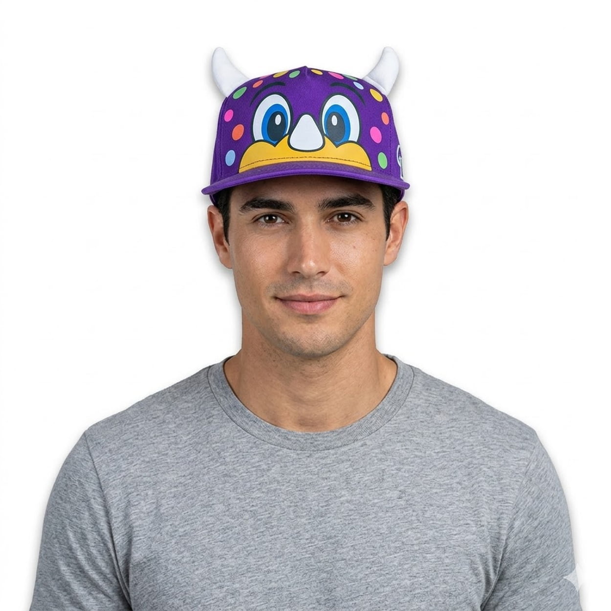 This cap features a playful design that instantly captures attention. The front panels showcase the friendly face of the beloved mascot, complete with polka dots, large eyes, and a prominent central snout. Sturdy 3D horns attached to the top add a fun, standout dimensional element to this unique piece of athletic headwear.