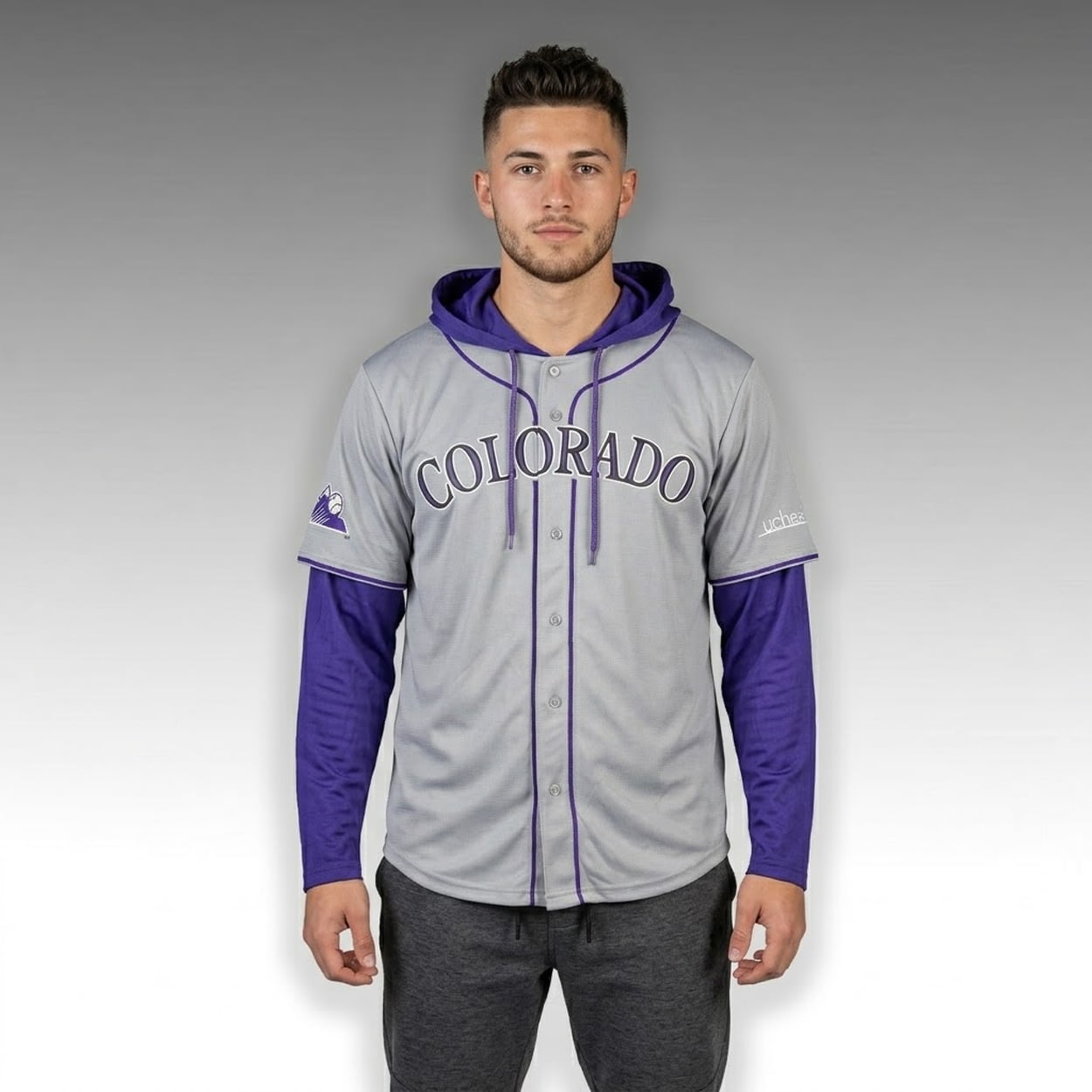 Step up your game-day layering with a bold, multi-functional design. The 2026 Rockies Jersey Sweatshirt features an innovative two-in-one aesthetic, combining a classic button-down jersey torso with attached long sleeves and a drawstring hood. The chest proudly displays the signature “COLORADO” wordmark in a traditional arch, while the sleeves are detailed with a mountain-themed secondary team logo and a sponsor patch. Contrasting piping along the placket seamlessly completes the dynamic, layered look.