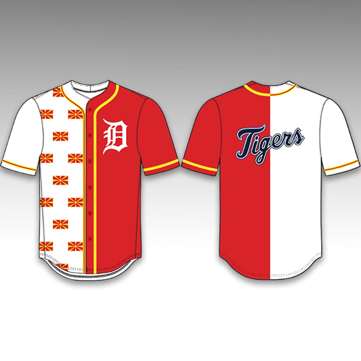 The 2026 Tigers Macedonian Heritage Jersey features a split-panel design on a classic button-down silhouette. One side of the front showcases a repeating pattern of the national sun symbol, while the opposite side displays the traditional English “D” logo on the chest. The back of the jersey highlights the “Tigers” script wordmark centered across the split background.