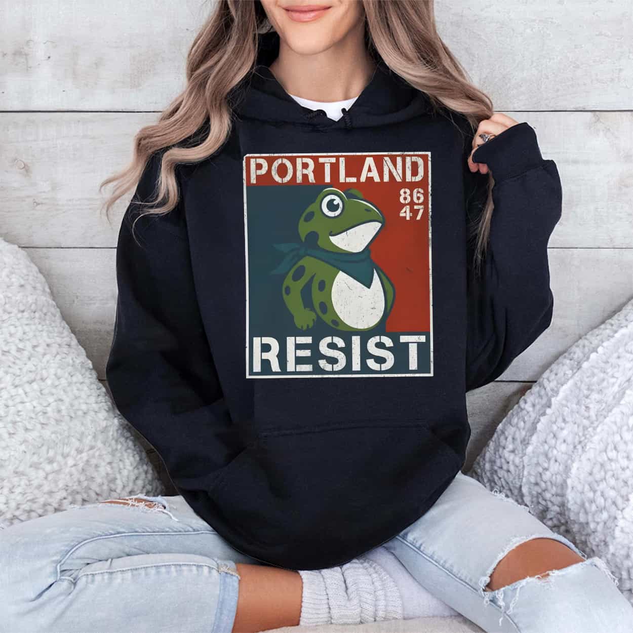 This garment is a direct piece of cultural history, commemorating the viral protest tactic used during demonstrations in Portland. The frog became a powerful emblem of nonviolent resistance, using absurdity and humor to challenge fear-based political narratives and the heavy federal presence. The code “86 47” is political shorthand: “86” means to “eject” or “discard,” and “47” references the 47th President. The shirt transforms this controversial slogan into a wearable, satirical statement.