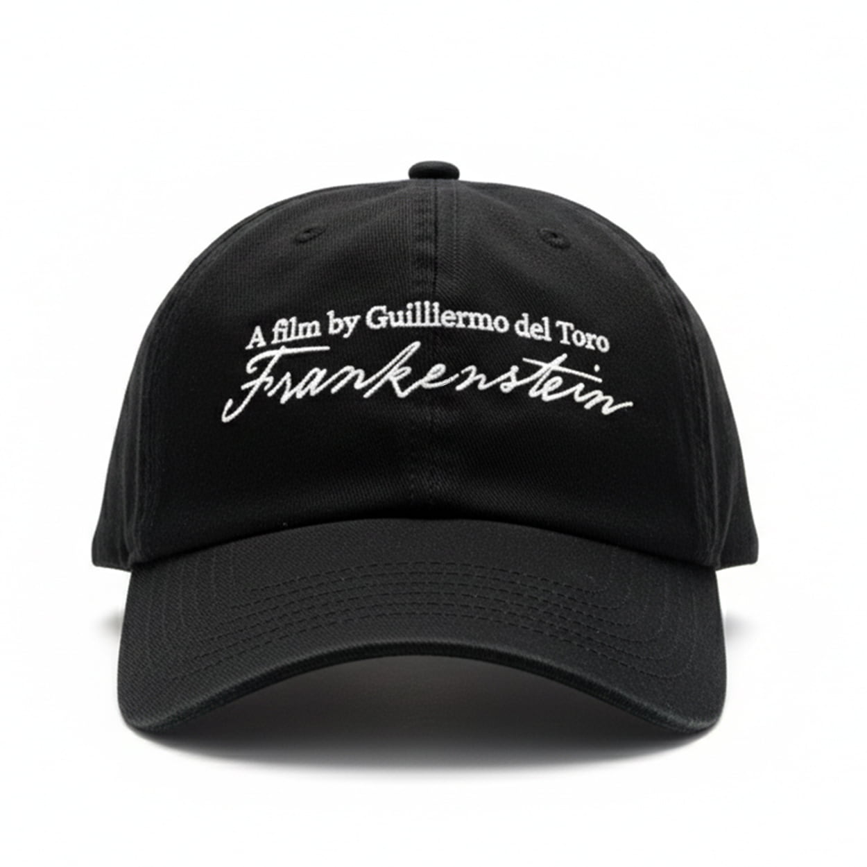 This premium black baseball cap makes a bold, artistic statement. It features minimalist white embroidery on the front, pairing the classic director’s credit “A film by Guillermo del Toro” with the title “Frankenstein” in a beautiful, stylized script. This is the logo from the highly anticipated film, making it an instant “if you know, you know” piece for film lovers.