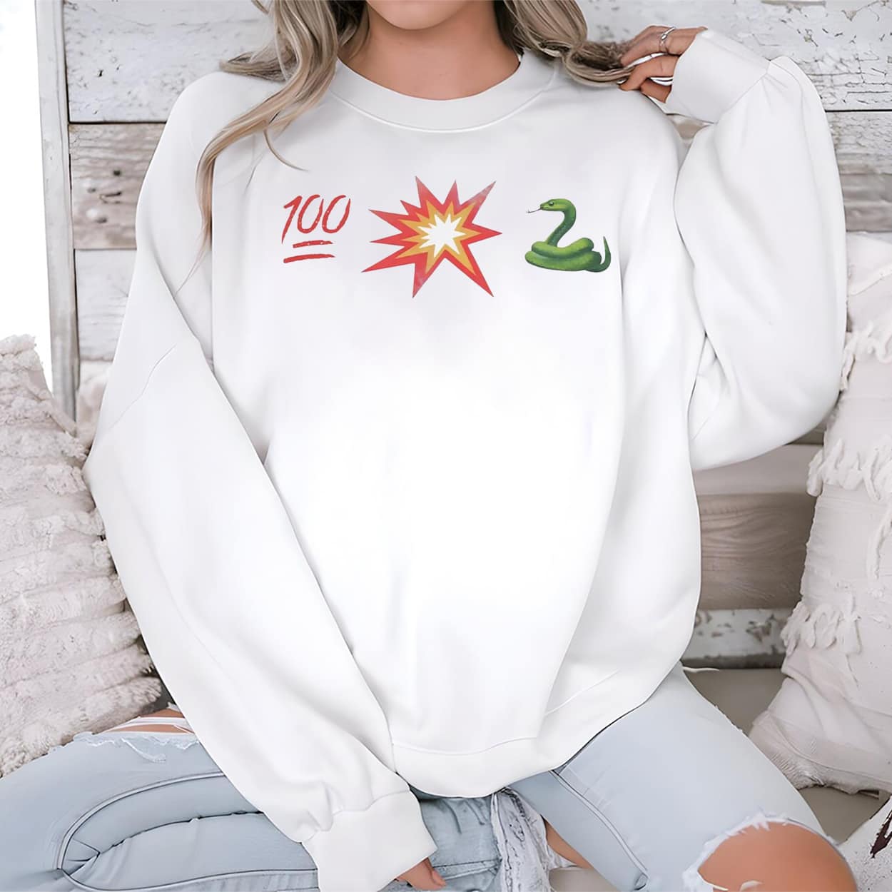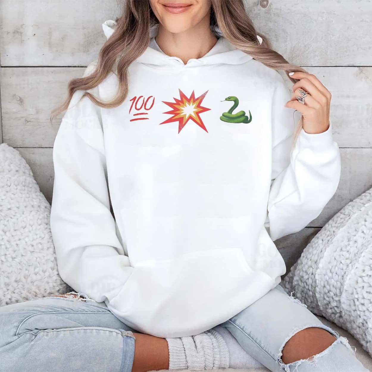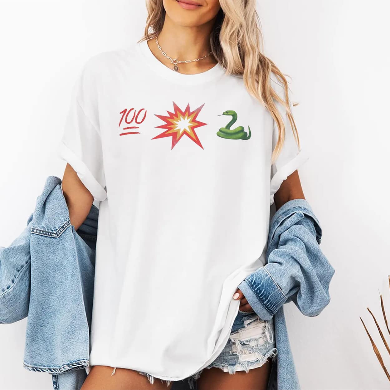 Make a clever, minimalist statement with the A’ja Wilson Wilt Bam Kobe Emoji Shirt. This tee features a clean, horizontal lineup of three distinct emojis printed directly across the center chest. The sequence begins with the underlined “100” symbol, followed by a jagged explosion or “bam” comic graphic, and concludes with a coiled snake. The text-free design relies entirely on these recognizable digital icons to deliver a bold, modern streetwear aesthetic that speaks directly to those in the know.