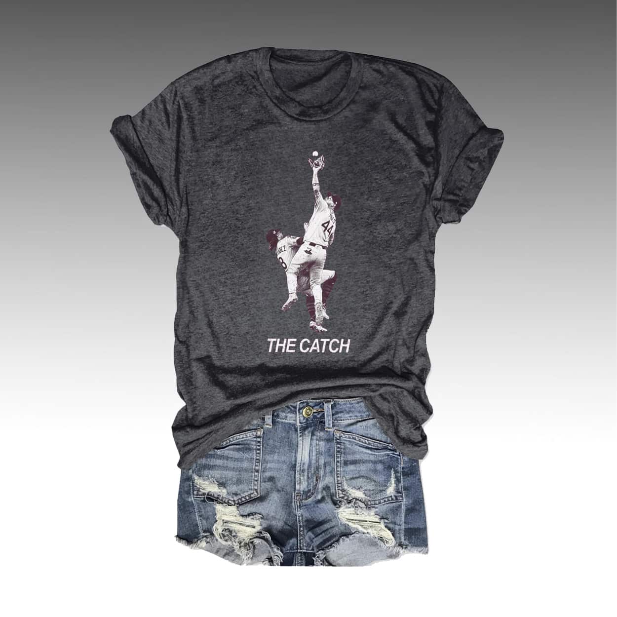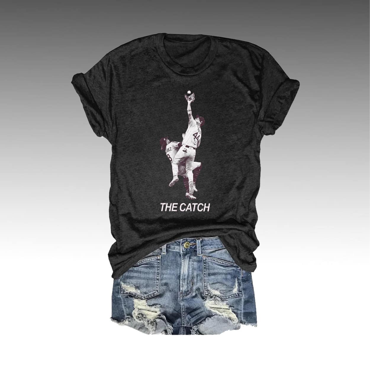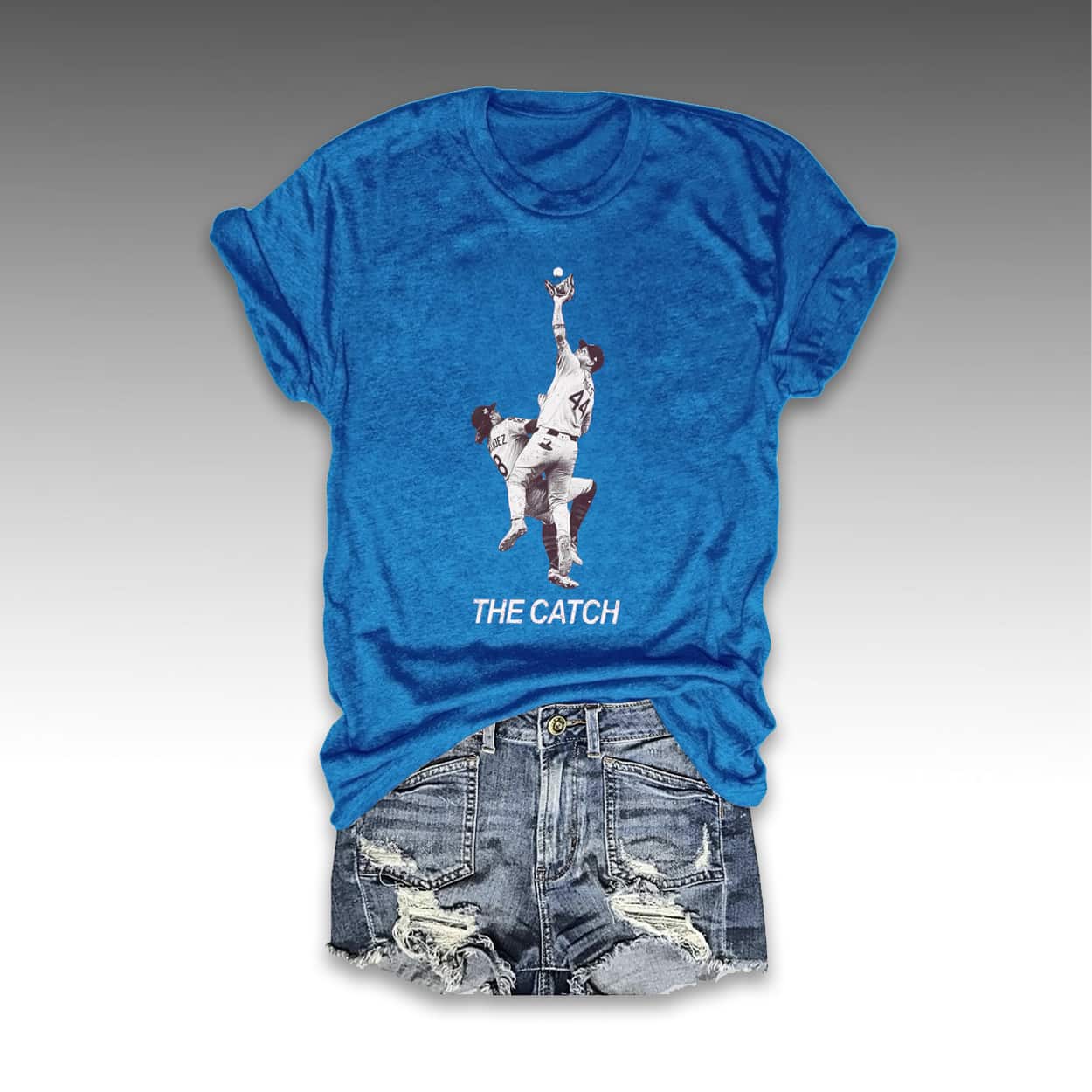 This t-shirt captures the single most iconic play of the 2025 World Series in a stunning, artistic design. The shirt features a stylized, duotone graphic of the legendary moment: Andy Pages soaring high at the wall, glove outstretched, colliding with his teammate Kiké Hernández. Below this incredible image, the shirt is simply and powerfully titled “THE CATCH,” letting the art speak for itself.