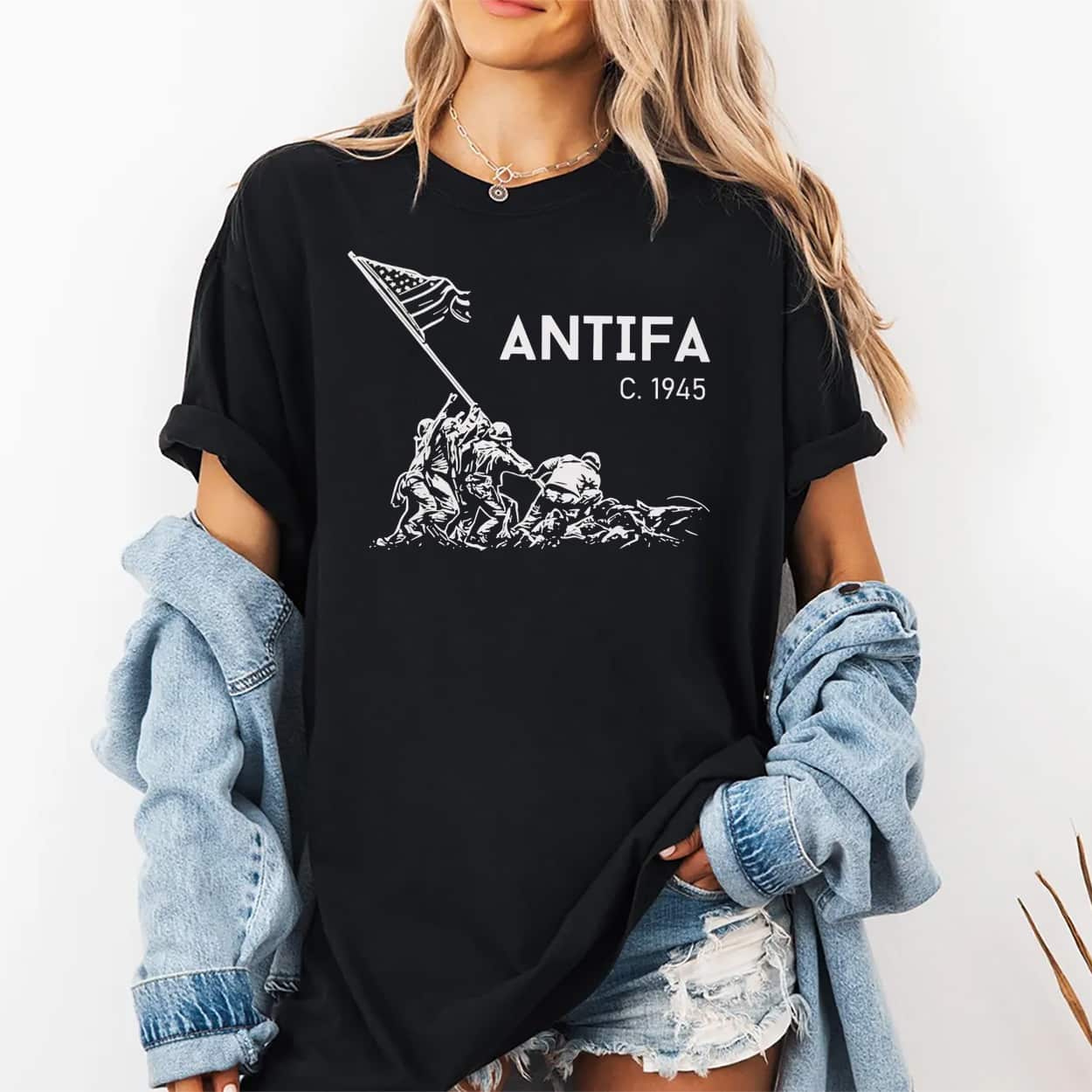 This ANTIFA C 1945 Shirt featuring a bold white “ANTIFA” headline above the iconic Iwo Jima flag-raising graphic, with “C. 1945” beneath. This shirt fuses historical symbolism and modern activism. Perfect for activists, history buffs, and statement-makers who value bold graphic design and comfort. Limited stock—order now to wear your values with pride.