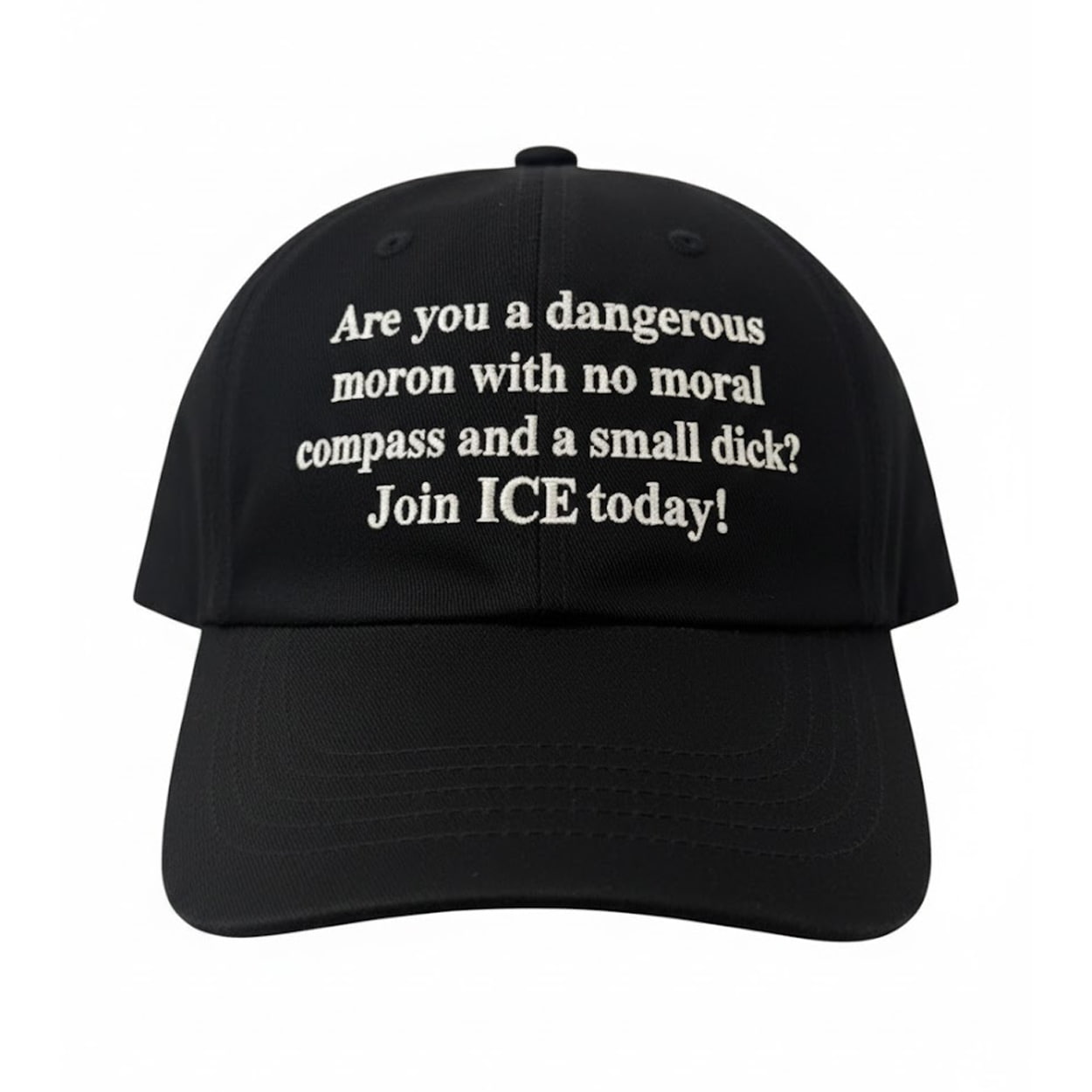 Wear your political stance on your forehead with this biting piece of satirical headwear. The design features a classic black structured cap with a long, provocative question embroidered in stark white serif font: “Are you a dangerous moron with no moral compass and a small dick? Join ICE today!”.