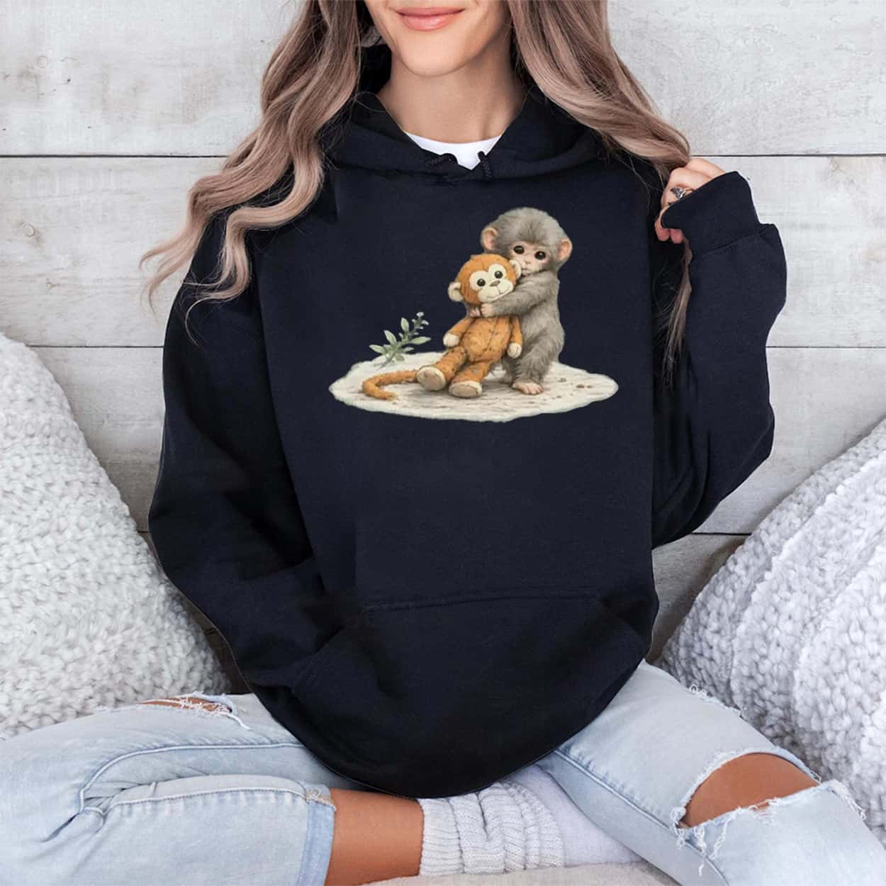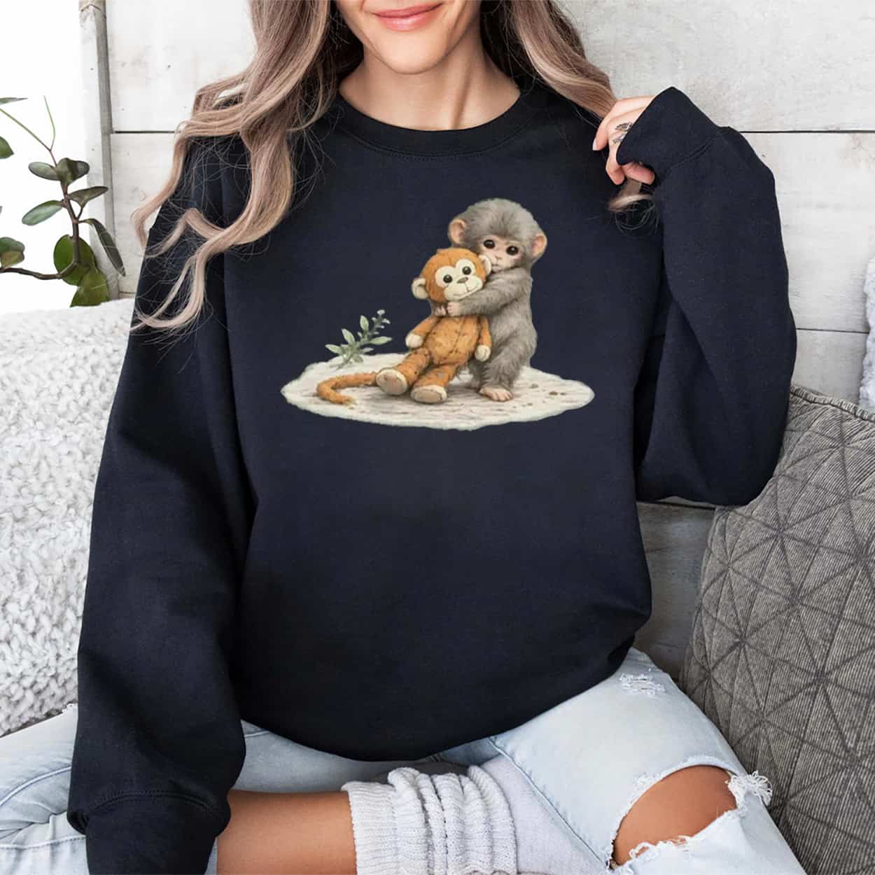 Capture the cuteness of a global sensation with the Baby Monkey Punch T-Shirt. The centerpiece of this design is a soft, illustrated graphic of a baby macaque gently hugging an orange monkey plush toy. The heartwarming artwork includes a small green sprig resting on the ground nearby, creating an endearing, natural scene that faithfully represents the famous primate and his favorite companion.
