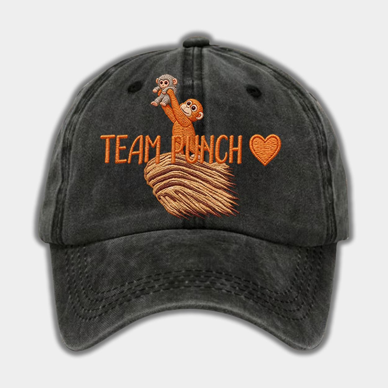 Show off your internet humor with the Baby Monkey Team Punch Hat. The front crown features an embroidered graphic of an orange monkey plush toy triumphantly holding a baby macaque up in the air. The characters are standing on a textured mound, and the artwork is flanked by the text “TEAM PUNCH” alongside a heart symbol.