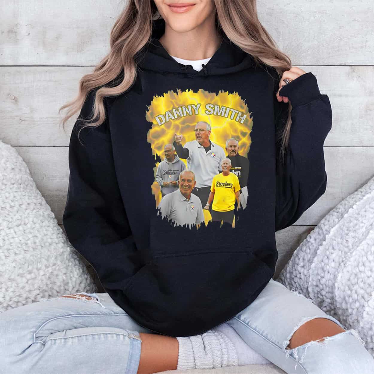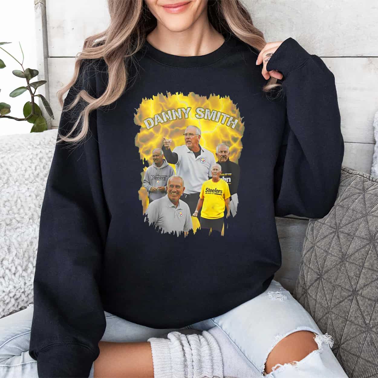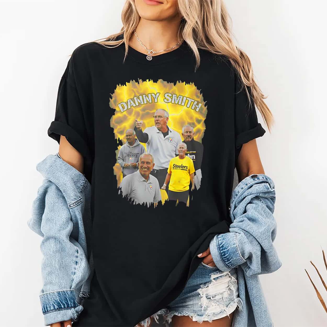 Ignite Steelers fandom with the Ben Skowronek Danny Smith Shirt. The design centers on “DANNY SMITH” in glowing, flame-like yellow lettering arching over a collage of five photos of the coach in various Steelers outfits, including polos and hoodies, set against a dramatic fiery background for visual punch.