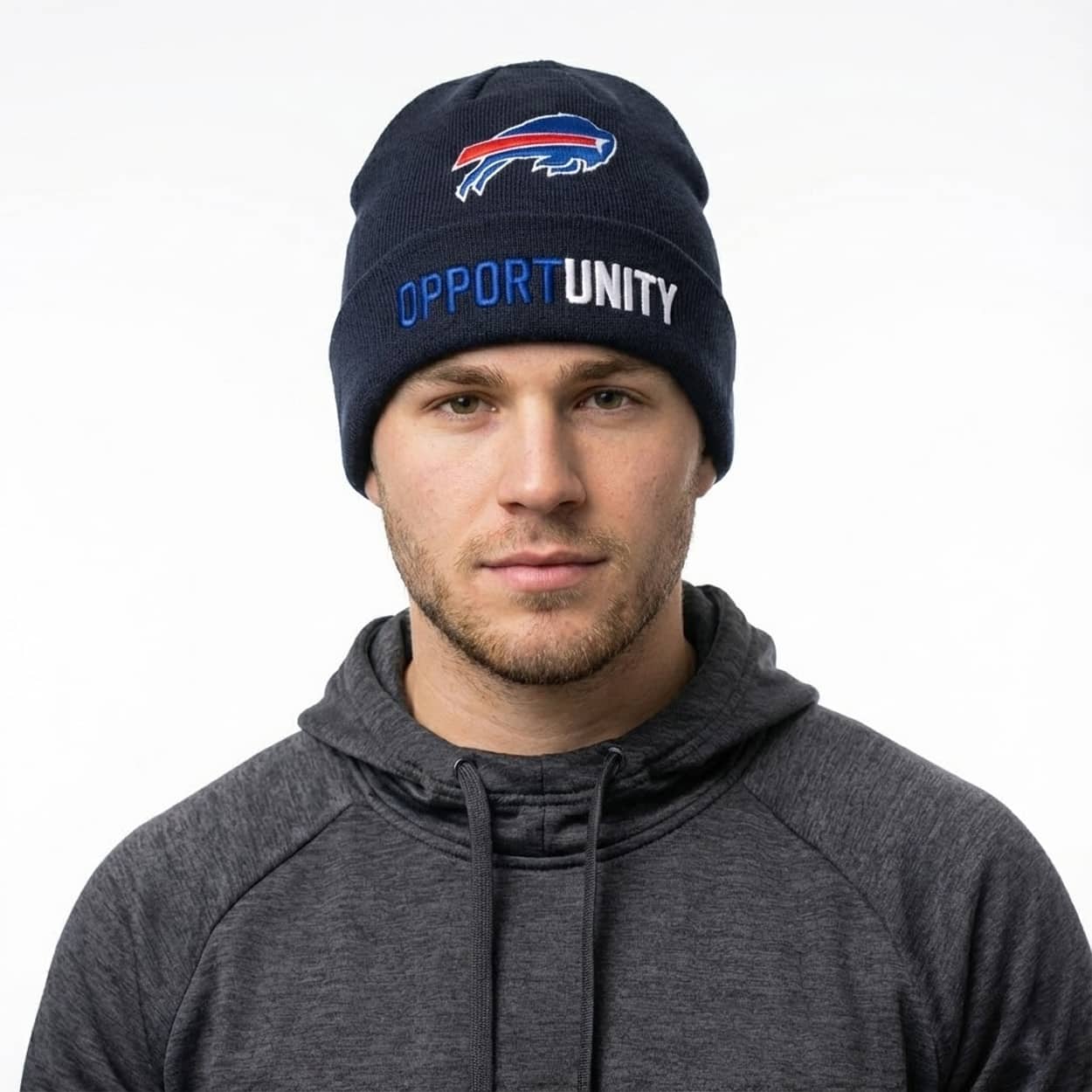 Stay warm in Bills style with the Bills Opportunity Beanie Hat, a cozy navy knit designed for social impact. The front showcases the iconic charging buffalo logo in blue-red-white embroidery, with “OPPORTUNITY” arched below in crisp blue and white lettering for a motivational punch, keeping the rest simple without extra graphics.