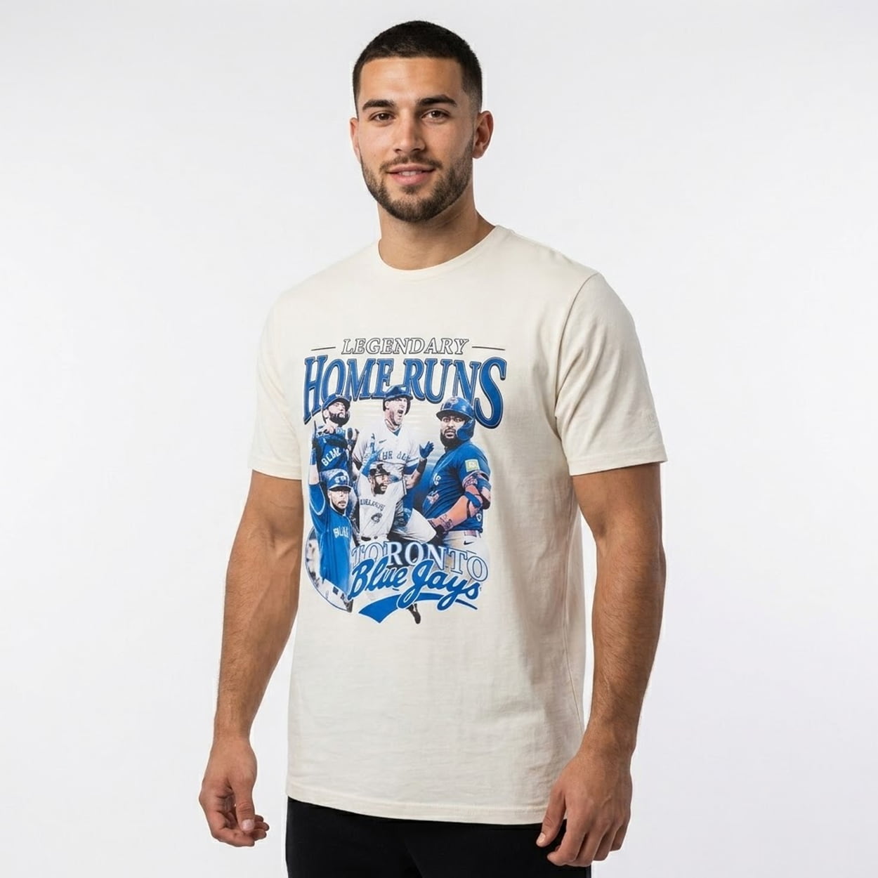 This t-shirt features a dynamic, vintage-inspired graphic that immediately catches the eye. The front proudly displays the bold “LEGENDARY HOME RUNS” typography above a striking action collage of iconic players celebrating their most unforgettable hits. It is perfectly finished with the classic Toronto team script at the bottom, blending athletic excitement with premium streetwear style.