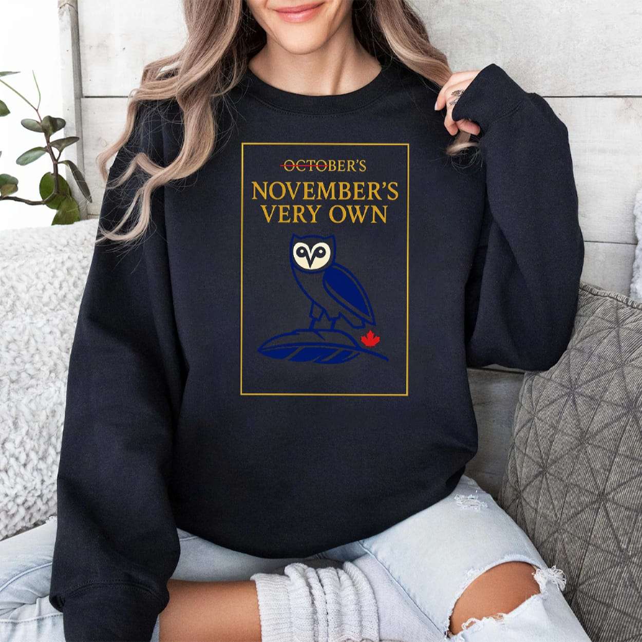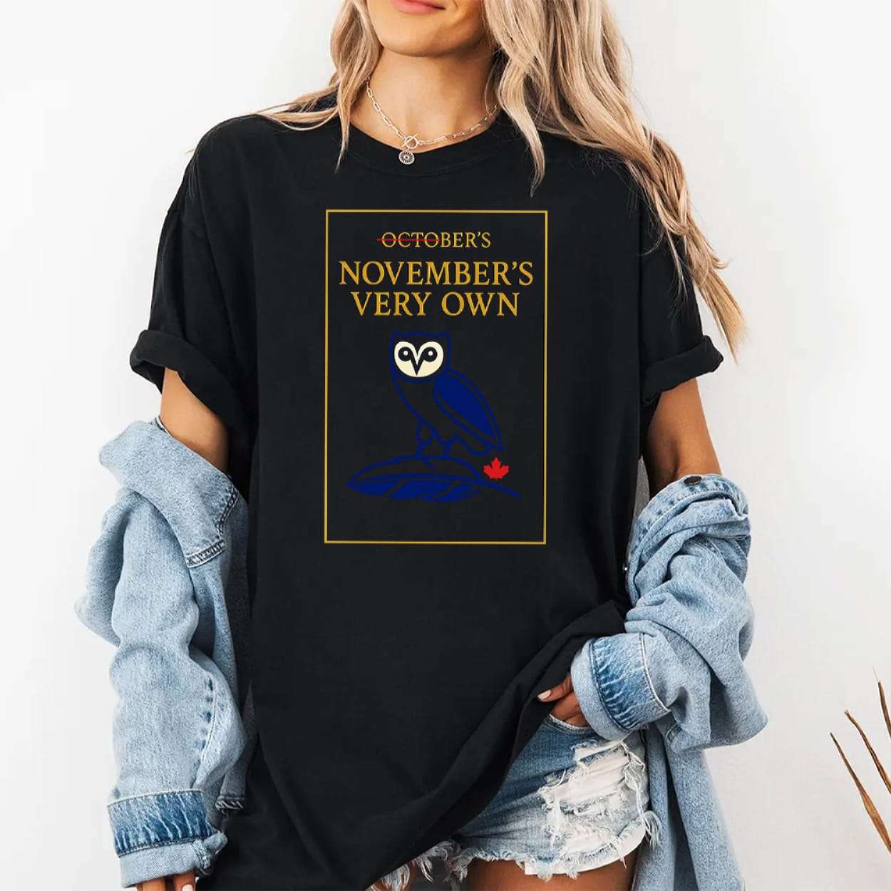 The Blue Jays November’s Very Own Shirt blends Toronto’s baseball legacy with cultural symbolism. Featuring a bold owl and maple leaf, it nods to Drake’s OVO movement and the Blue Jays’ fierce World Series rivalry with the Dodgers.