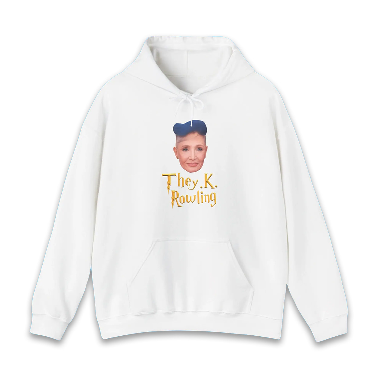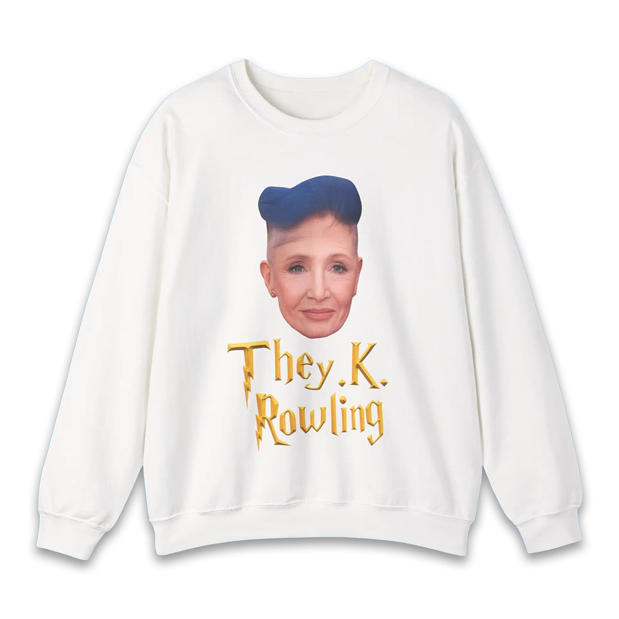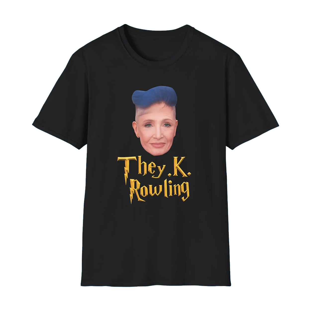 This shirt is a direct parody of J.K. Rowling’s name, featuring her image with the text “They. K. Rowling”. This phrase uses the gender-neutral pronoun “They” to satirize the author’s controversial stance on transgender people.