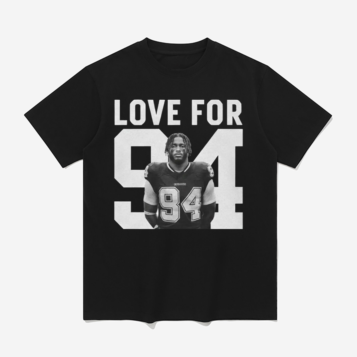 The Love For 94 Shirt presents a poignant design with “LOVE FOR” above a massive “94” that incorporates a grayscale image of Marshawn Kneeland in his Cowboys uniform. The graphics fuse bold white lettering with the player’s portrait for a respectful, eye-catching tribute.