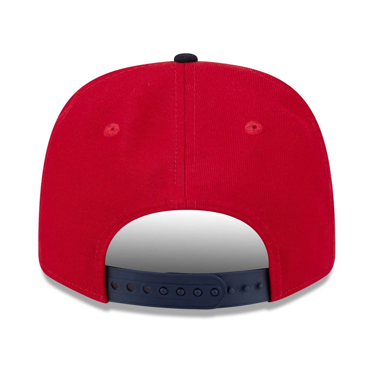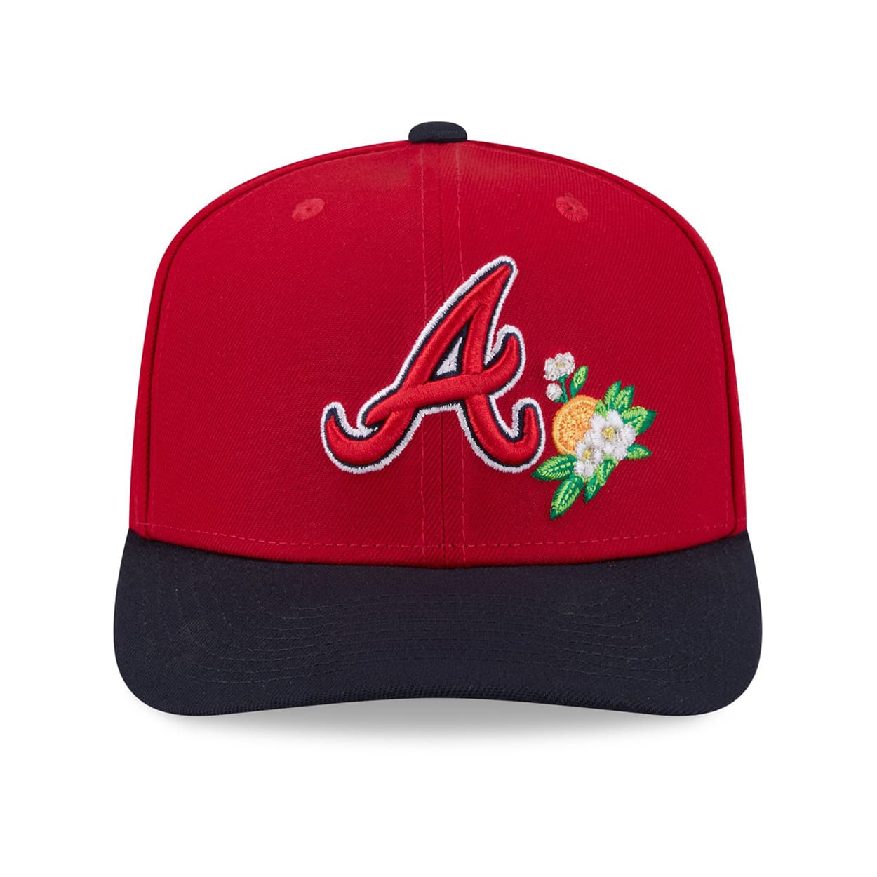 This cap ignites your game day look with a vibrant red crown and a classic navy flat brim. The front panel features the legendary script “A” in raised navy and white embroidery, uniquely paired with a detailed citrus graphic of a sliced orange and white blossoms. A commemorative diamond-shaped “26” patch on the side depicts a tropical sunset and palm tree, while the navy snapback closure ensures a secure, custom fit.