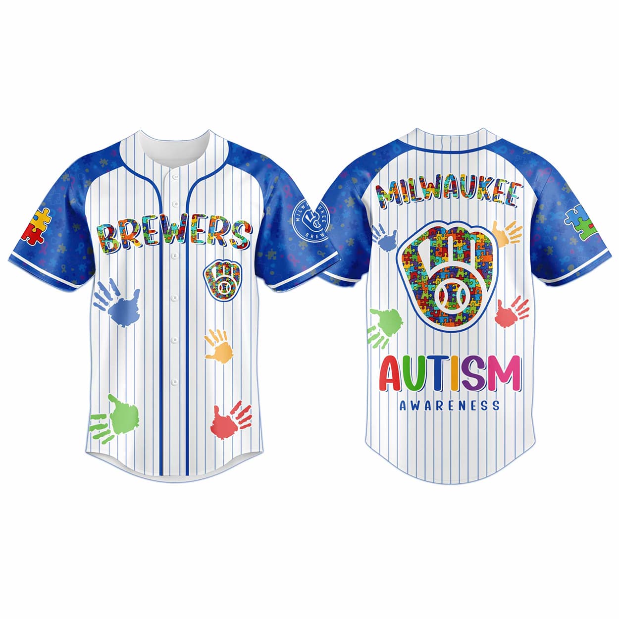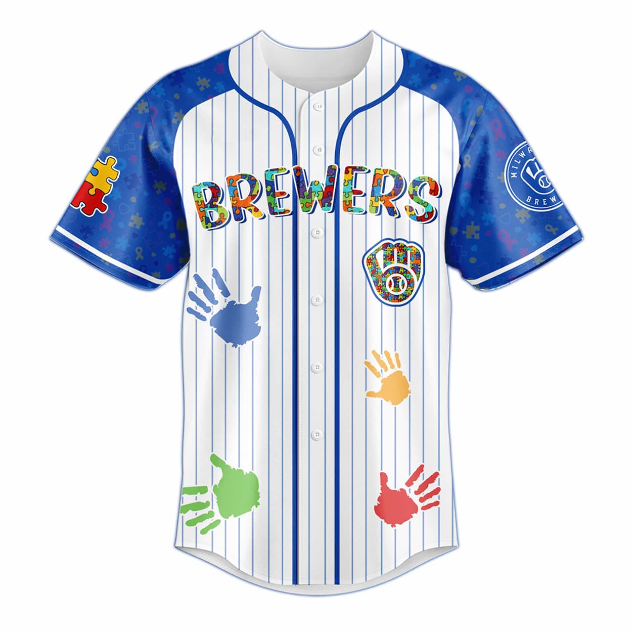 Show your support for neurodiversity with the Brewers Autism Awareness 2026 Jersey. Featuring an intricate puzzle piece motif inside the classic glove logo and playful handprint graphics across a pinstripe design, this apparel is perfect for passionate fans and advocates. Celebrate community spirit, raise vital visibility, and make a meaningful impact at the ballpark or everyday events. Don’t miss out on this inclusive Milwaukee baseball gear—order yours today and wear your heart on your sleeve!