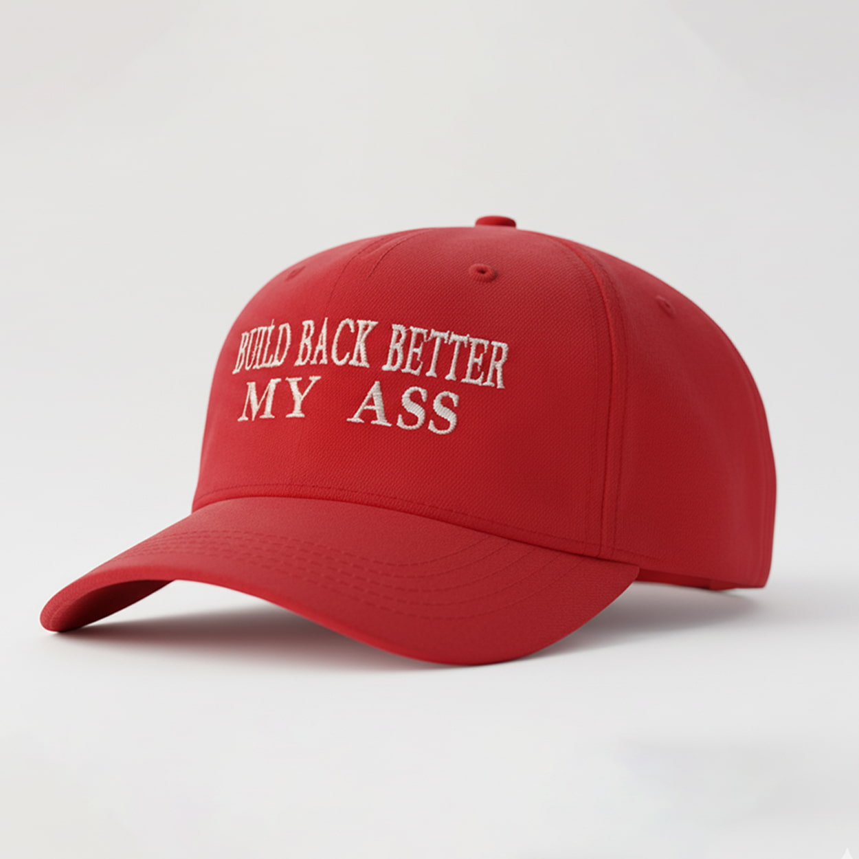 This fiery red cap isn’t here to play nice. With crisp white embroidery that reads “BUILD BACK BETTER MY ASS,” it delivers a punch of sarcasm wrapped in classic Americana style. Whether you’re at a rally, a backyard BBQ, or just strolling through town, this hat makes sure your stance is unmistakable. Structured for a confident fit and designed to provoke chuckles, nods, and maybe a few raised eyebrows, it’s the ultimate accessory for those who don’t shy away from speaking their mind.
