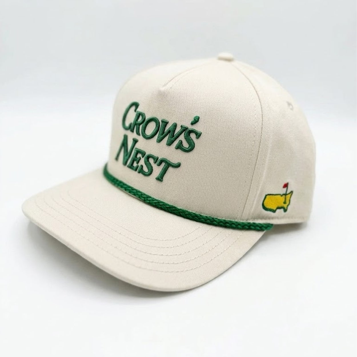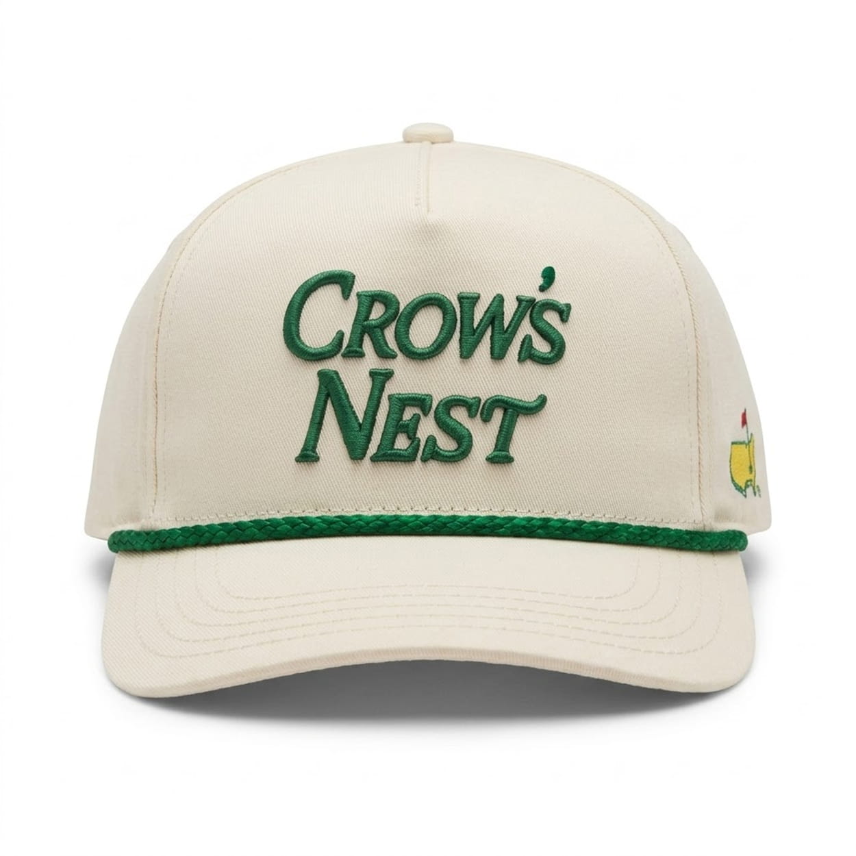 The front crown proudly displays “CROW’S NEST” in bold, raised serif embroidery. It features a classic braided rope across the visor base and a custom-stitched national map emblem pierced by a traditional golf pin on the side panel. This structured five-panel cap perfectly balances modern athletic appeal with vintage country club aesthetics.
