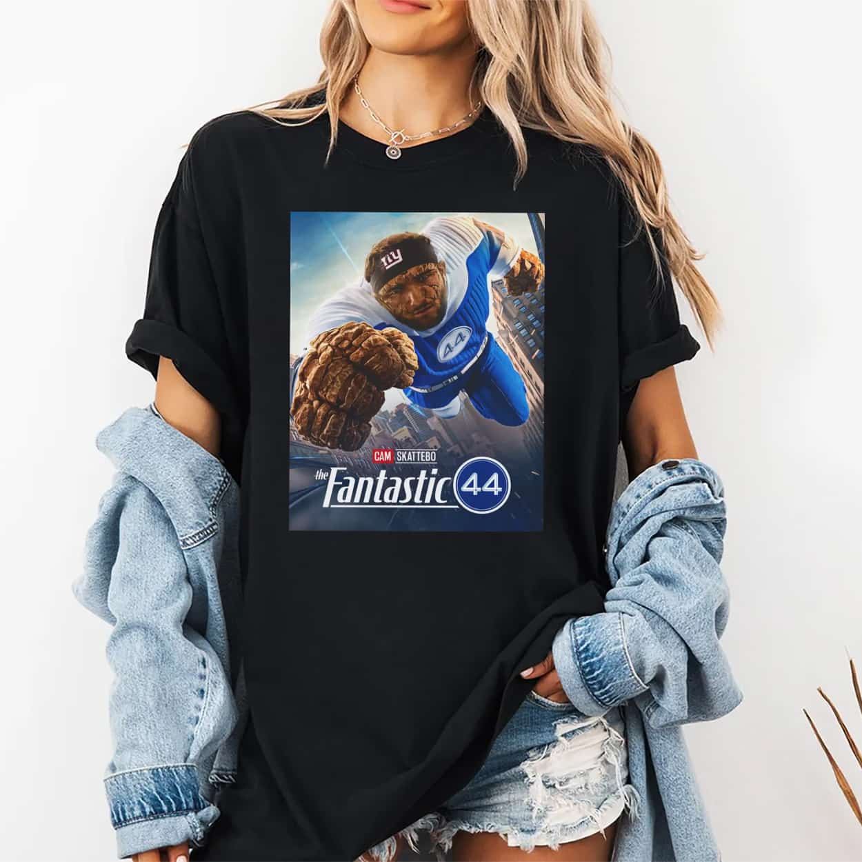 This shirt features a dynamic, full-color print of football player Cam Skattebo reimagined as a comic book superhero, specifically referencing The Fantastic Four’s “The Thing”. The design showcases him mid-flight, with a rock-textured fist, wearing a blue and white suit, a New York Giants logo on his headband, and the bold text “The Fantastic (44)” at the bottom.